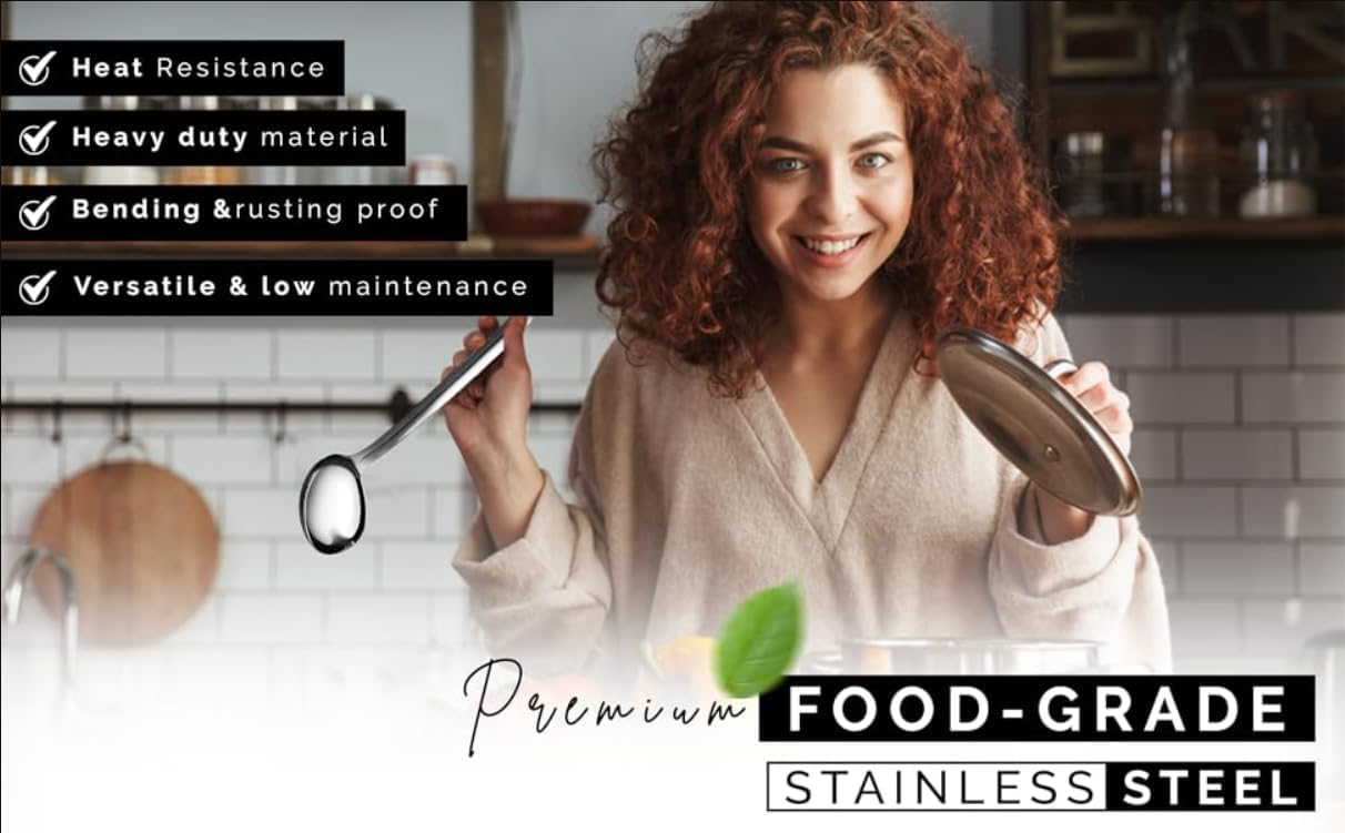 Metal Cooking Utensils Set: Made of food grade stainless steel, forged in one-piece, durable and anti-rust. Very clean lines, good weight and balance, comfortable grip.