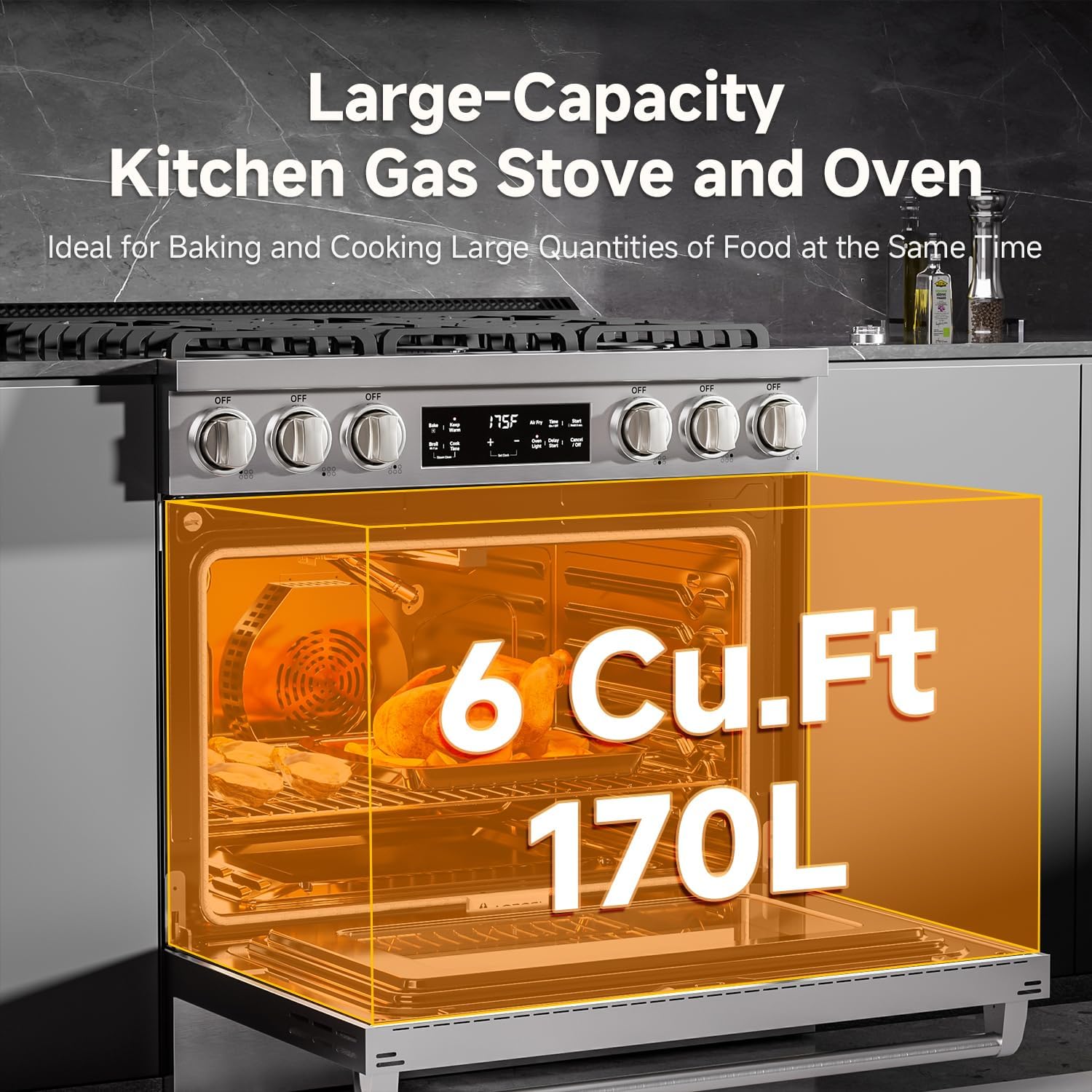 Large Capacity Smart Touch Control Ovens:The AAOBOSI oven range comes with extra large ovens of 6 Cu. Ft/ 170L capacity.The oven includes multiple functions: baking, air frying, convection grilling, warming, delayed start, timed cooking, and timer on/off. With two enameled baking pans and two stainless steel baking racks. Inside the oven there are convection fans, temperature probes and explosion-proof lights for even baking in a 360° surround. The oven door with triple insulated glass and anti-scald stainless steel door handle, you can always observe the oven inside the food baking level, bring you a more perfect cooking experience.