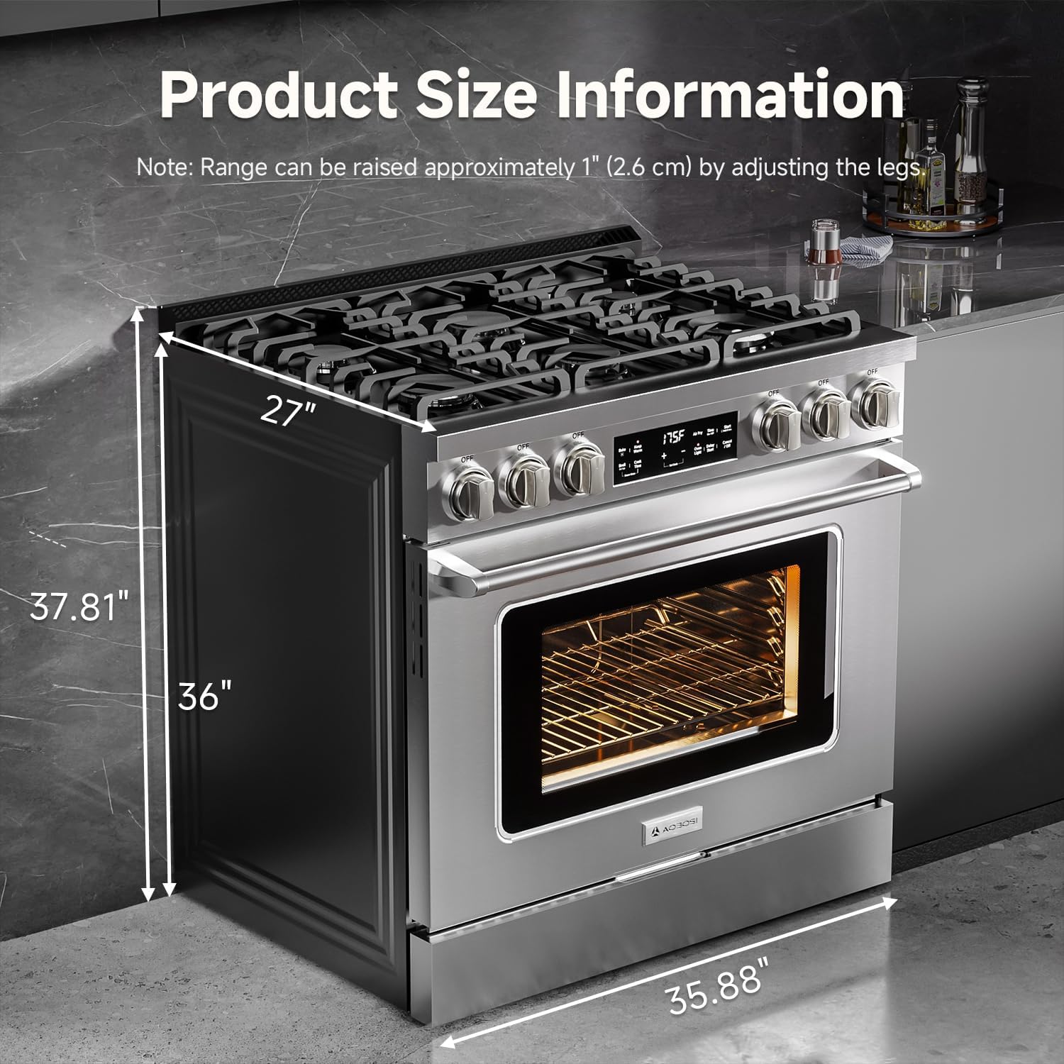 Multiple Efficiency Gas Stoves: Product size:35.88″L*27″D*36″H, AAOBOSI gas stove range provides 5 different BTU outputs: 22,000 BTU, one 18,000 BTU, two 12,000, one 6,000 BTU,and 3,500 BTU modes, a significant boon for those tasked with catering to large family gatherings or those who aspire to craft a multi-course meal within a constricted time-frame,confers upon its user the power to juggle an array of dishes simultaneously. Black matte thicker cast iron continuous burner grates has a long service life.