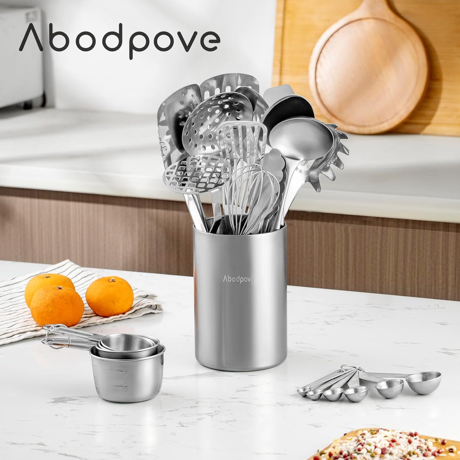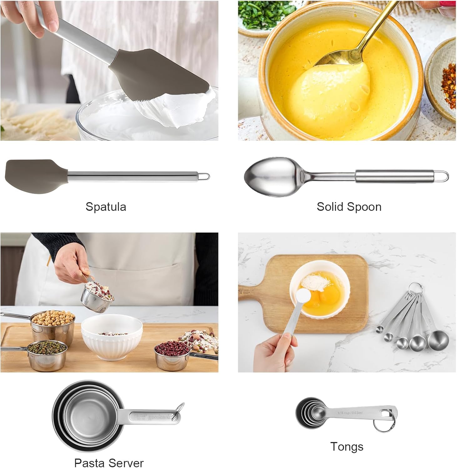 STAINLESS STEEL UTENSILS SET: This stainless cooking utensils set comes with 23 various tools, including measuring cups and spoons set, spatula, potato masher, basting spoon, ladle, pasta server, slotted turner, solid turner, slotted spoon, whisk, and tongs