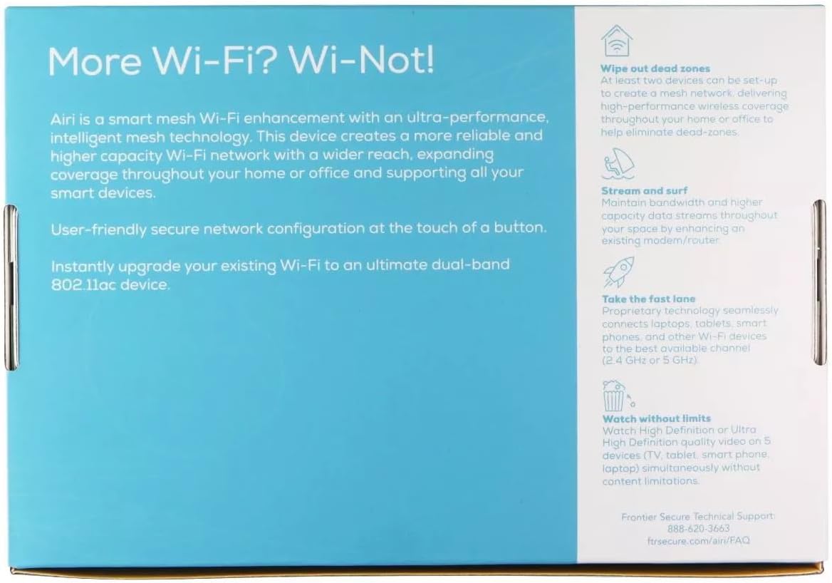 Upgrade your home or office network with the Frontier Secure Air 4920, a powerful dual-band Smart Mesh Wi-Fi Access Point designed to eliminate dead zones, enhance speed, and ensure smooth, uninterrupted connectivity for all your devices. With blazing-fast 1600Mbps combined speed and 802.11AC technology, the Air 4920 delivers reliable Wi-Fi performance across both 2.4GHz and 5GHz bands, ensuring seamless HD streaming, gaming, browsing, and video conferencing – even with multiple devices connected. Whether you’re extending your existing network or creating a mesh system for whole-home coverage, the Air 4920 is your plug-and-play solution. Ideal For: Homes with weak Wi-Fi coverage in certain rooms or floors Streaming 4K videos, online gaming, and video conferencing Small offices needing reliable, flexible networking Adding wired connectivity in locations without Ethernet drops