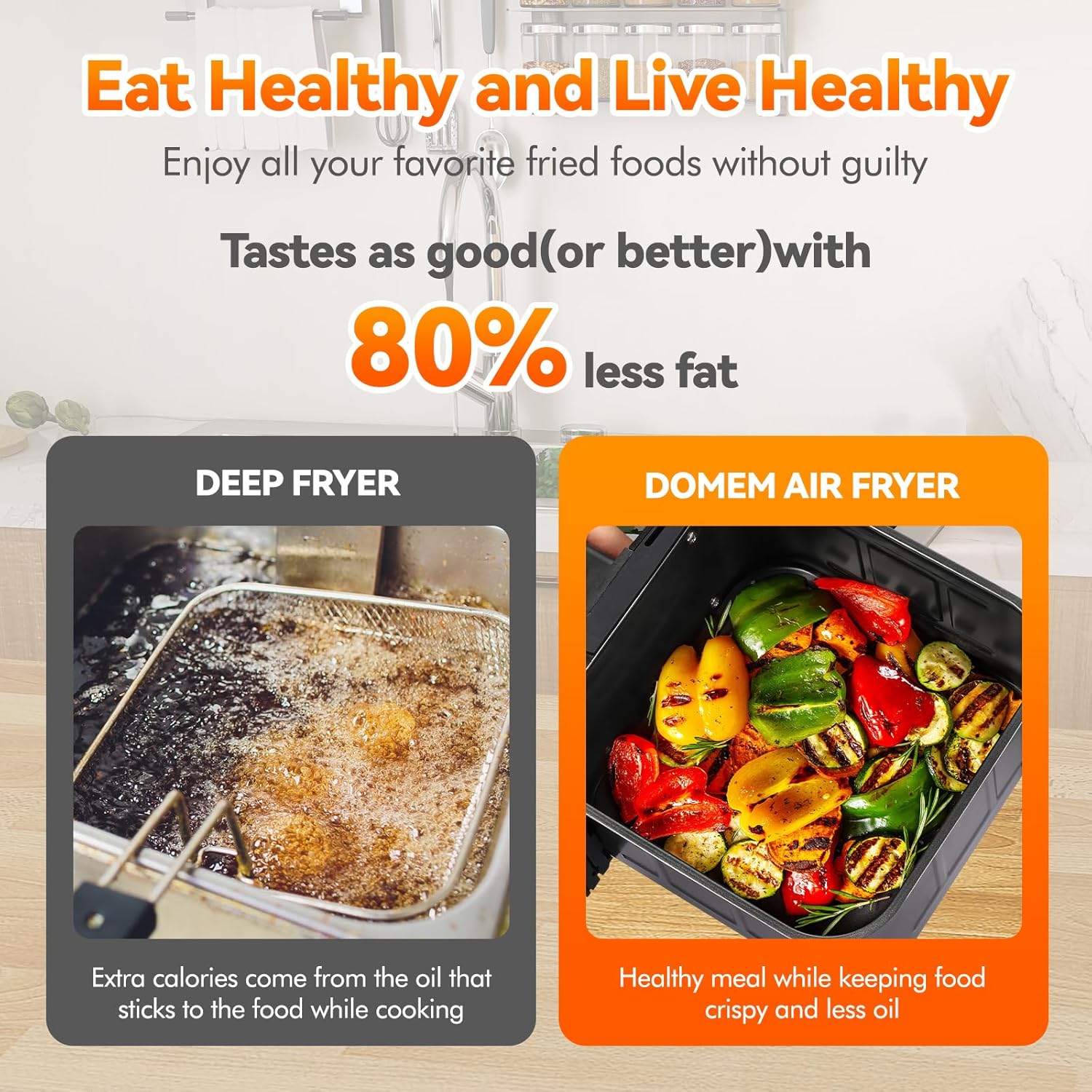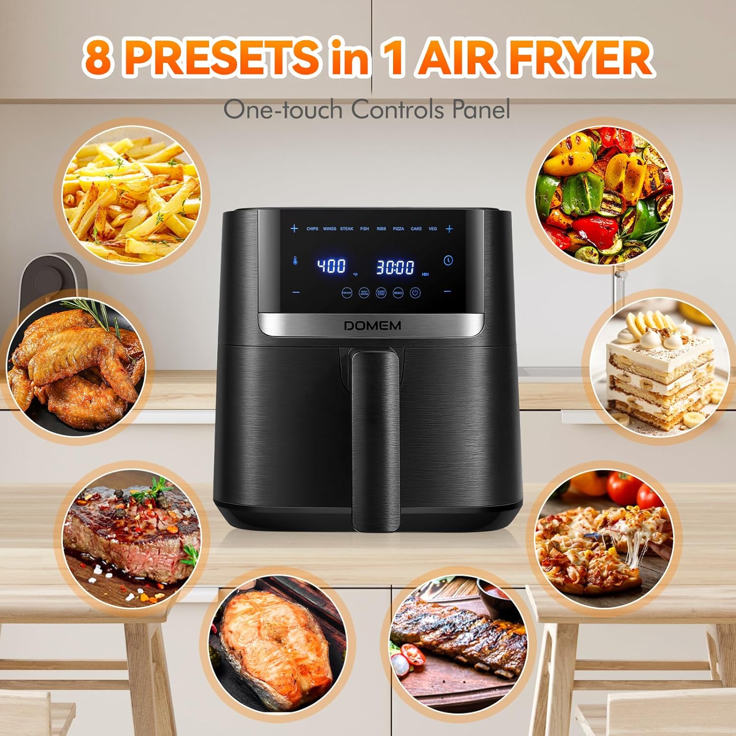 MULTIFUNCTION PRESET: Including french fries, wings, steak, fish, ribs, pizza, cake and vegetable, DOMEM developed 8 presets for this air fryer, according to most people`s preference.