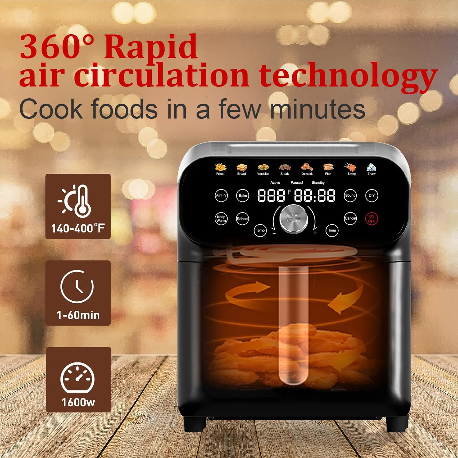 17 Cooking Functions: 8 Healthy Recipes – Fries, Bread, Vegetables, Steak, Drumsticks, Fish, Shrimp, Thaw. 5 Assist Cooking Functions – Air Fry, Bake, Keep Warm, Reheat, DIY: Customize the time and temperature to suit your needs. 4 Control Functions – Sound:Turn off button sound at any time (buzzer sound cannot be switched off), Cancel, ON/OFF, Knobs: Setting up the timer (1-60 mins) and the temperature (175-400°F) is a breeze! Just turn the control knobs and set to your desired temp and time.