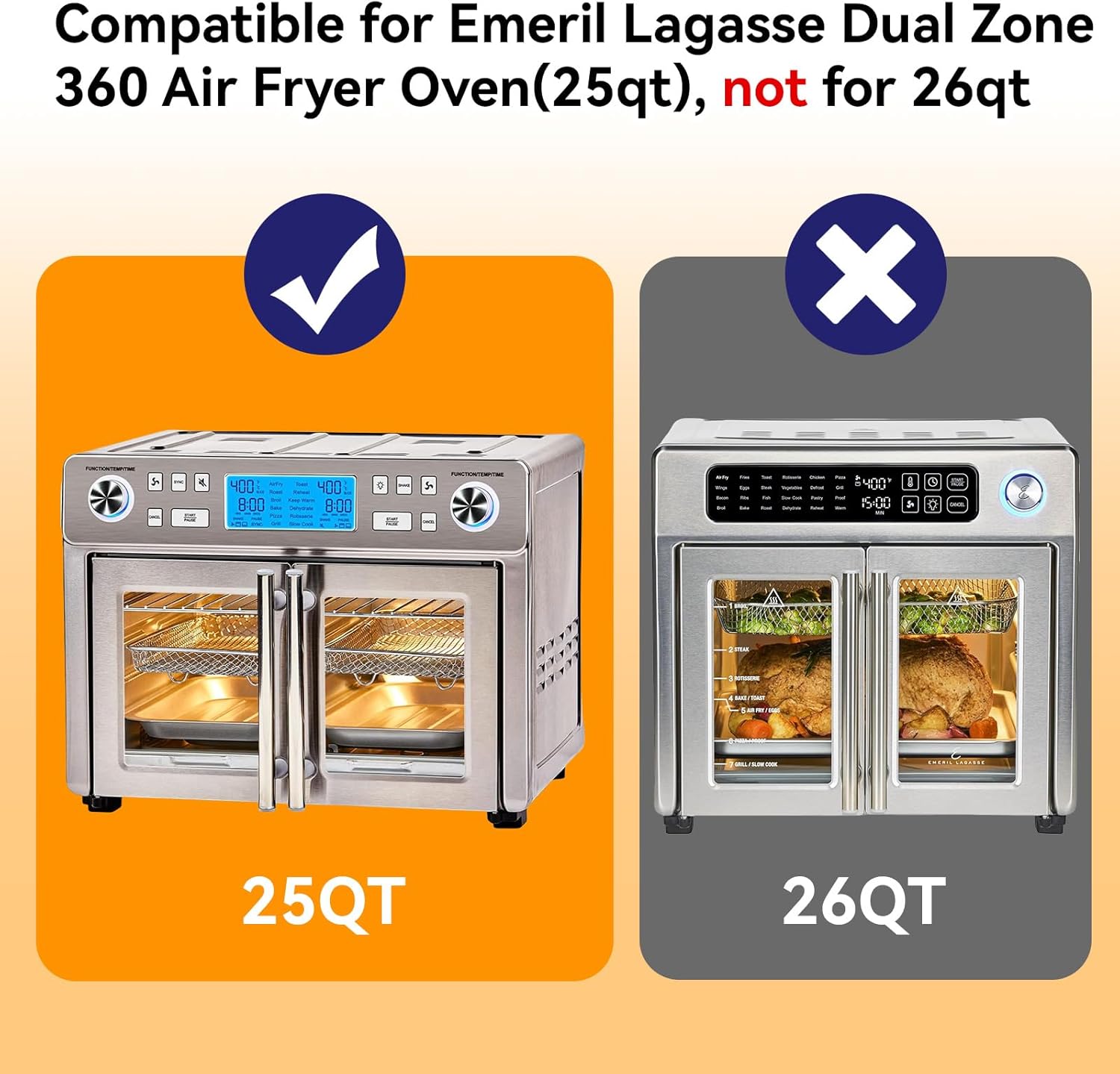 Please note that these air fryer accessory are only compatible with the Emeril Lagasse Dual Zone 25 QT Oven, not for Emeril Lagasse 26qt air fryer oven. Please check your machine model carefully!