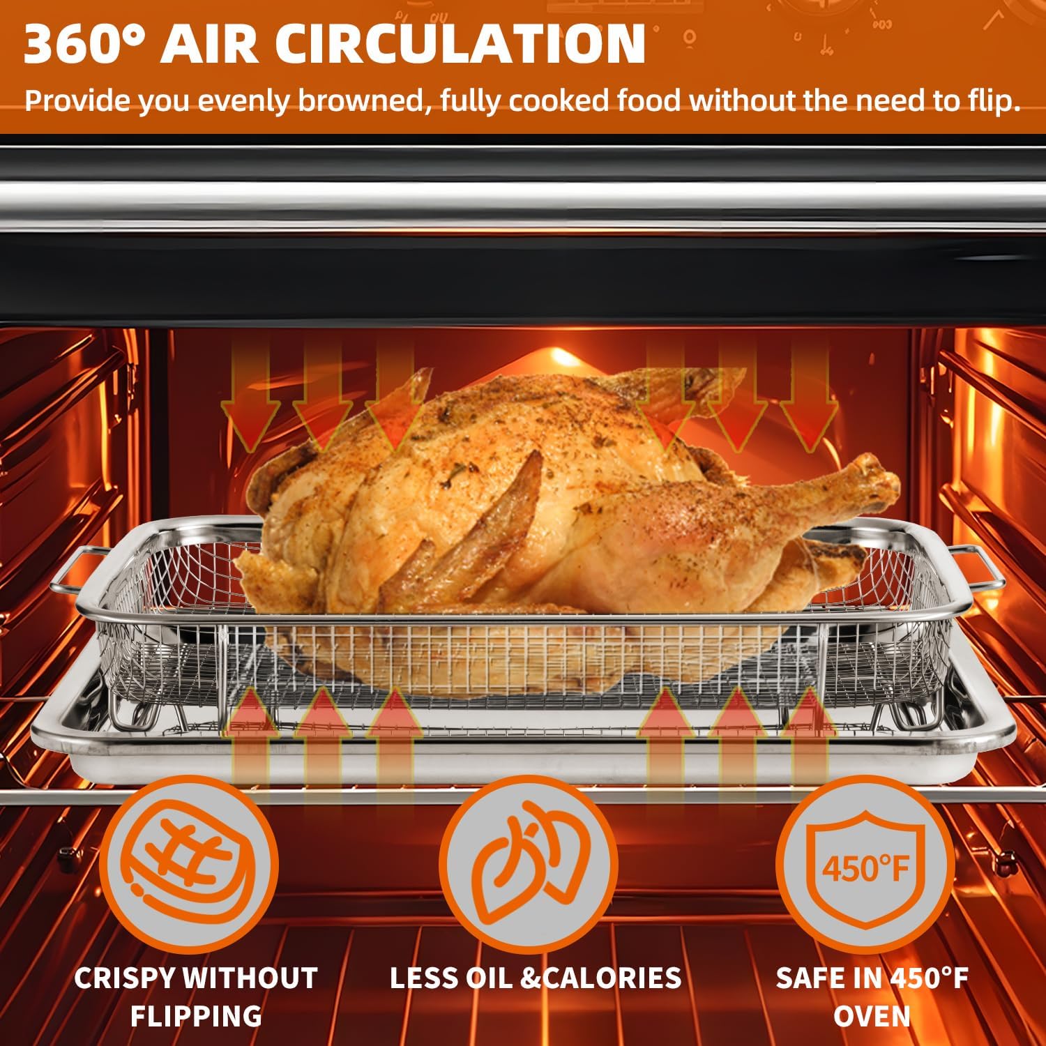 Air Fryer Basket for Oven,12.8″ Air Fryer Stainless Steel Basket with 50 PCS Parchment Papers, Air Fryer Accessories, Nonstick Air Fry Crisper Tray with Baking Pan, Bone Air Fryer Guide