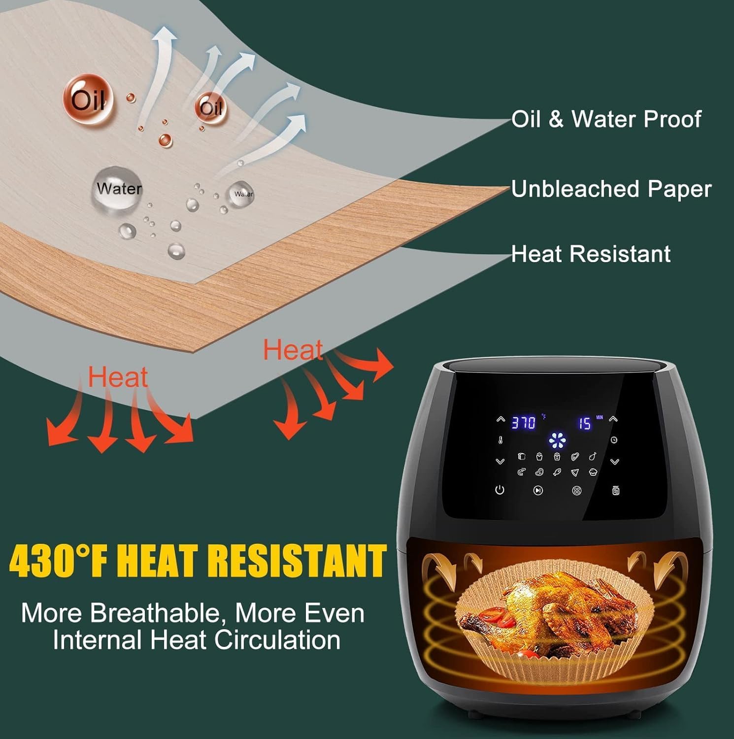 Healthy Material: The air fryer disposable paper liner is made from 100% food-safe parchment paper that is oilproof, waterproof, non-stick and heat resistant. It can withstand temperatures of up to 428℉ while retaining the flavor of the food. We pay more attention to the health and hygiene of the materials.
