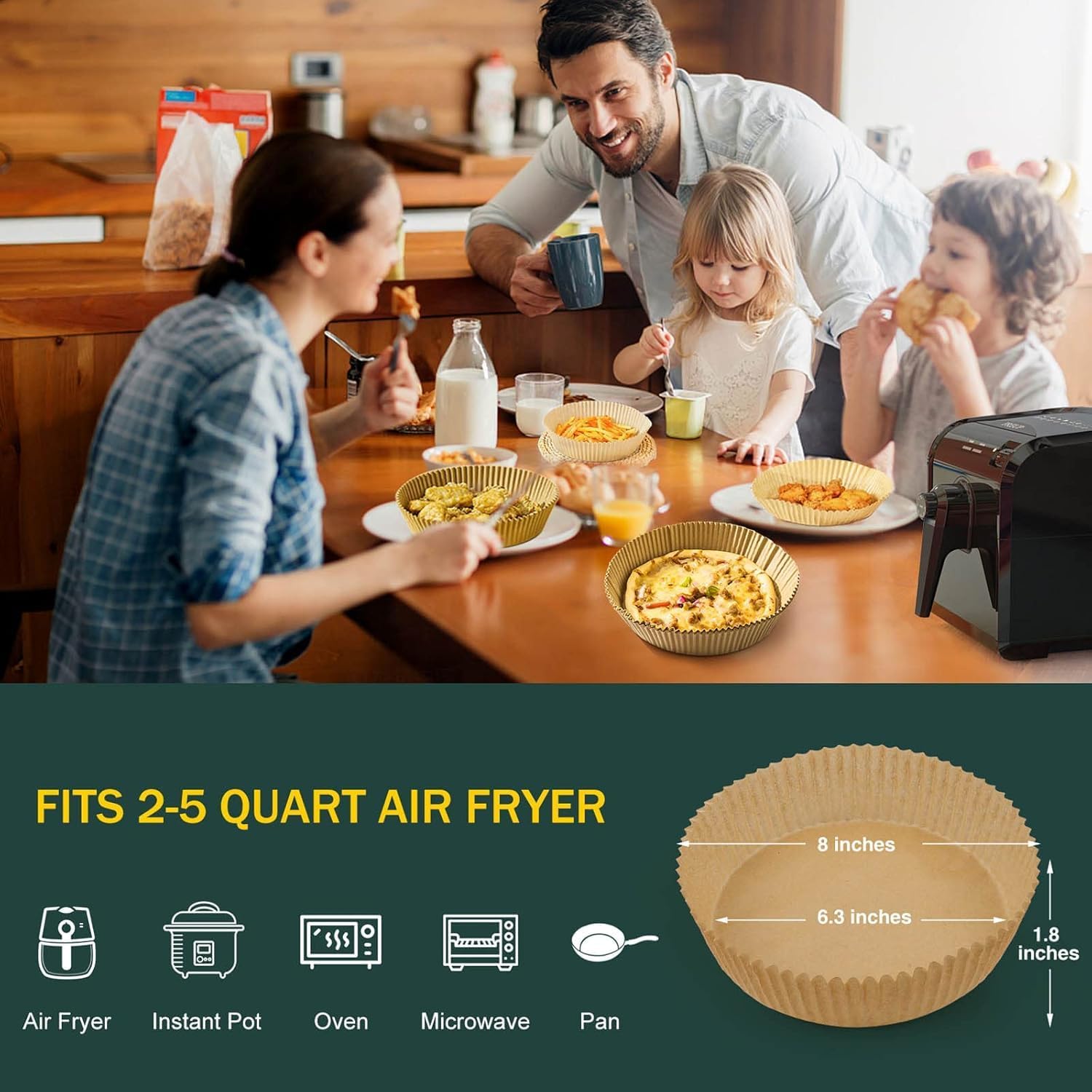 Widely Used: 125 PCS 6.3-inch parchment paper for air fryers, microwaves, ovens, steamers, cookware, etc. You can use it to hold pizza, sausages, meatloaf and more. The packaging is lightweight and portable, perfect for camping, outdoor barbecues, holiday parties and home baking.