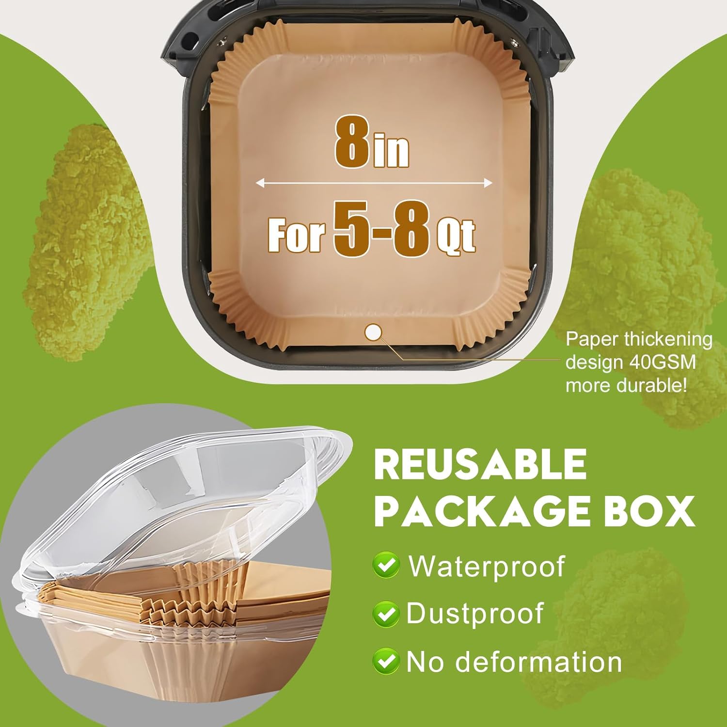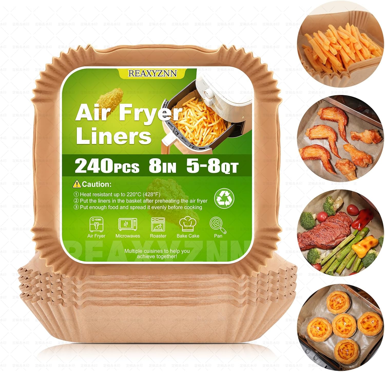 【Heavy Duty Liners】:Made of high strength thick paper and silicone coating, these air fryer liners disposable can withstand a temperature up to 428℉, they won’t be torn or damaged during the cooking process. 【Easy Baking & Cleaning】:Featuring a non-stick and oil-proof surface treatment, it prevents food from sticking and the oils from seeping through, making your baking and cleaning easier than ever. 【Food Safe】:Made of premium food grade unbleached natural paper and silicone coating, these air fryer liners are BPA-Free & PFAs-Free, they won’t release harmful substances during your baking. 【Multi-Purpose】: These parchment paper can perfectly fit 5-8 QT basket for ninja air fryer, it’s also suitable for ovens, steamers, microwave and more. 【Value Package】:Package includes 240 pcs 8 inch square air fryer paper liners, perfect for daily party and household use.