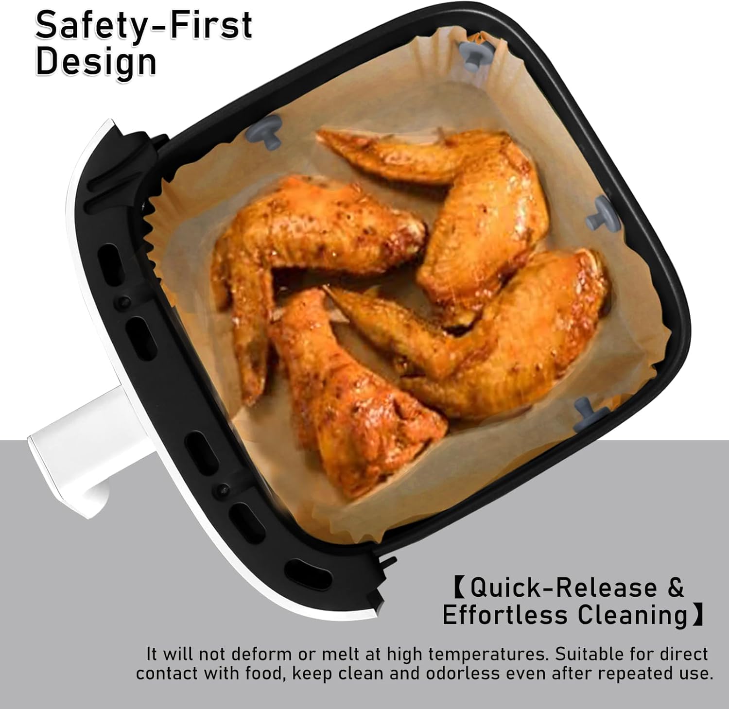 Food-grade & non-toxic: Our air fryer magnets for parchment paper made of 100% food-grade silicone that safely contacts food, resisting odors and harmful chemicals even air fryer temperatures up to 464°F.