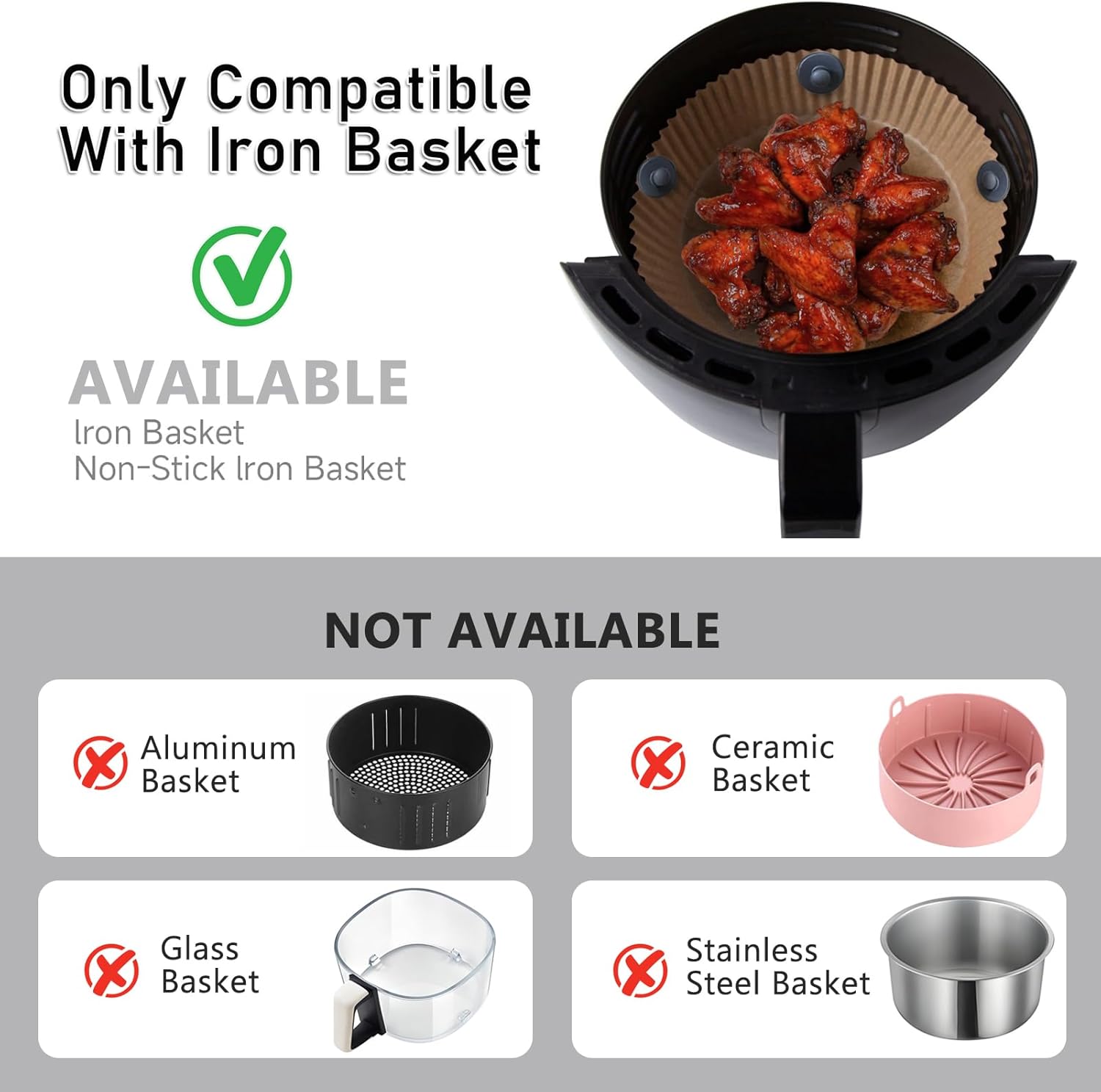 Universal fit: Designed for air fryer with magnetic metal baskets (test with fridge magnets first),strong adsorption, no need to worry about the stability of liners baking paper,not applicable to other materials such as plastic and aluminum.