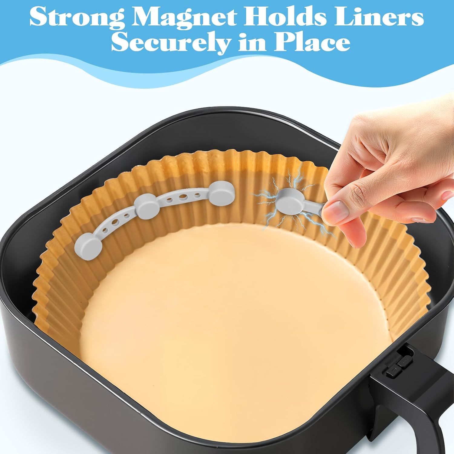 【Strong Magnetic Hold】Powerful built-in magnets firmly secure parchment paper liners in place, preventing them from curling, shifting, or covering your food during cooking. This allows hot air to circulate evenly around your ingredients, delivering crispier texture and enhanced flavor.