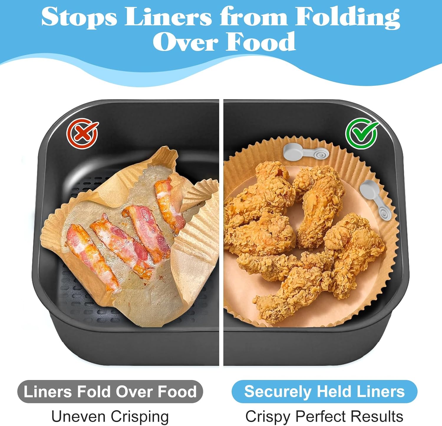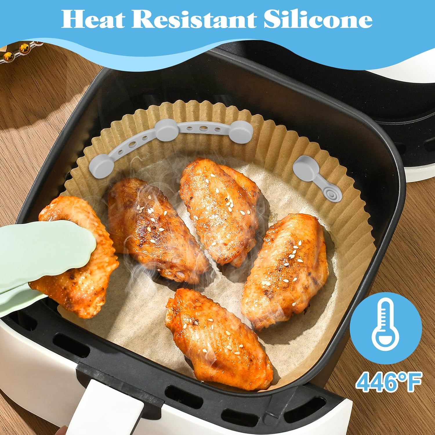 【Prevent Fire Hazards】These magnetic silicone clips keep liners securely in place, preventing them from blowing around or touching the heating element. This helps reduce the risk of burning or fire, making air frying safer and worry-free.