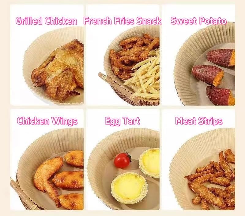 Excellent Oil-Proof Material: Made of excellent parchment paper and coated with a special non-stick layer, effectively resists oil penetration. When air frying fatty foods like bacon or French fries, the oil stays on the paper and not pensentreting into the air fryer basket, maintaining the cleanliness.