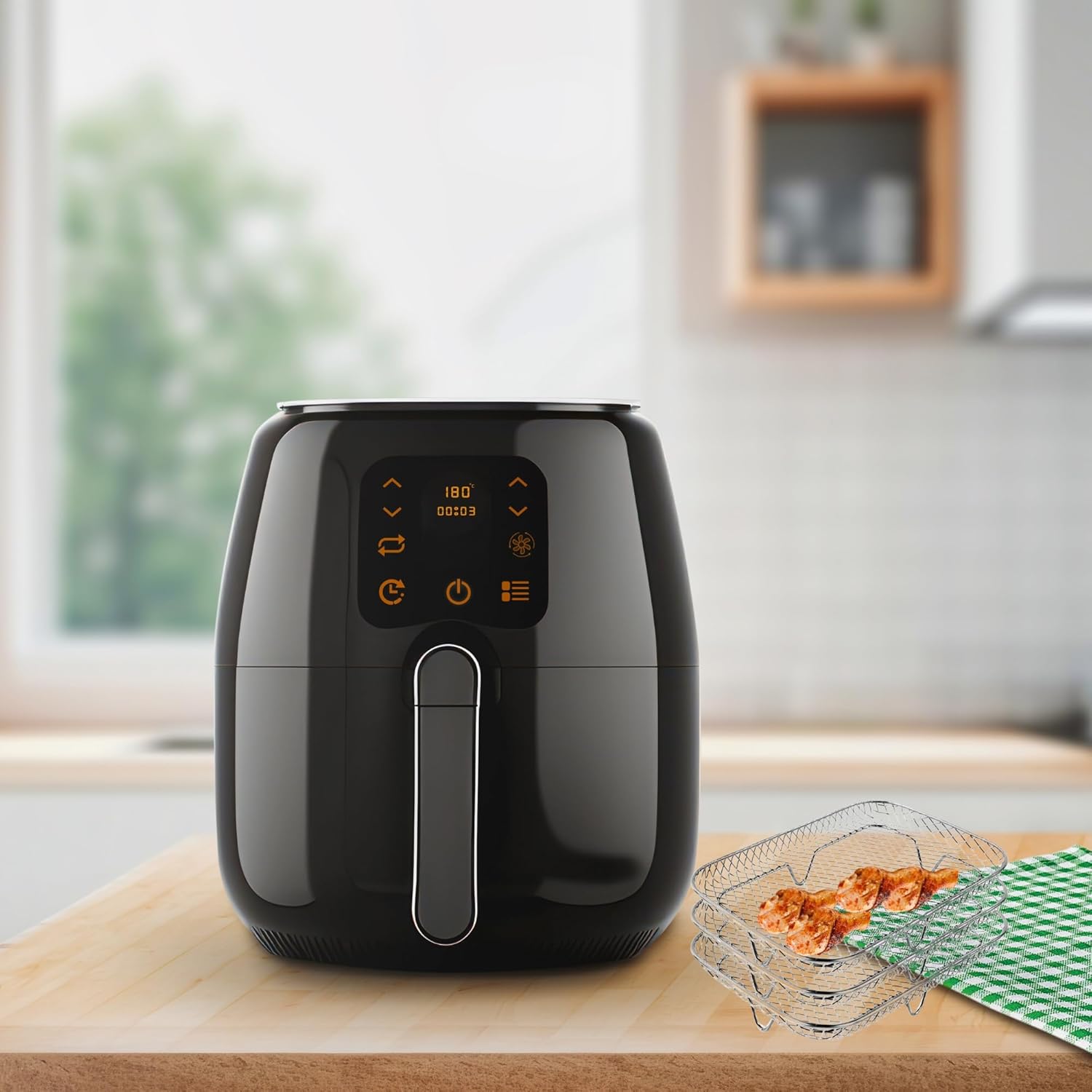 3 Stackable Layers Rack: Three-layer stackable racks helps you maximize your space in your air fryer to cook a variety of foods. You can reduce the layers of the racks depending on the amount of food, facilitating individual movement and access