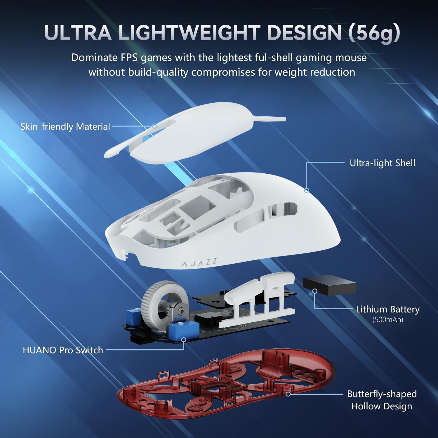 Ajazz AJ099 Superlight Wireless Gaming Mouse, Ergonomic 54g Ultra Lightweight 2.4Ghz/Wired Computer Mouse, PAW3311 12000 DPI Optical Sensor, 200Hrs Battery Programmable Buttons for Win/MAC PC Gamers