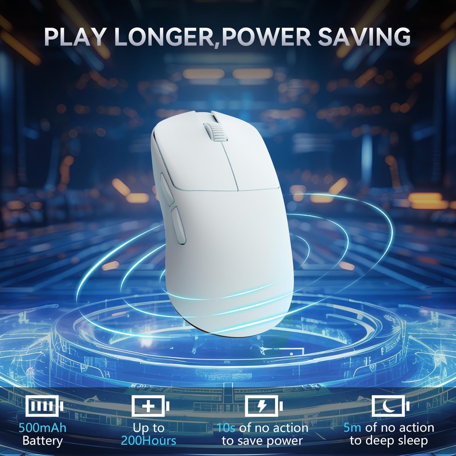 【500mAh Battery, Play longer, Charge less】Broadcom low-power chip and excellent power solution extends the battery life of the AJ099 rechargeable mouse up to a mighty 200 hours, a full charge only needs 2-3 hours and lasts over a week. Smart sleep protects the battery and extends usage time, AJ099 will enter sleep mode after 5 minutes of inactivity.