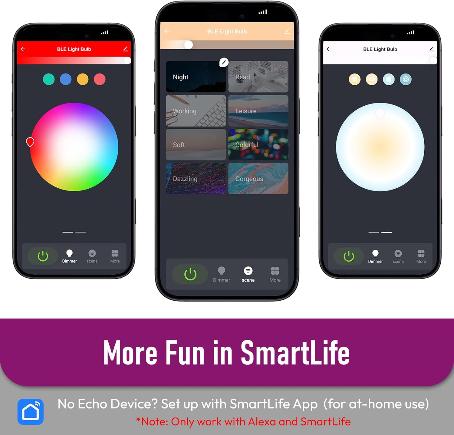 More Fun in Smart Life App: If you don’t have an Echo device, you can still set up this color changing light bulb with the SmartLife – Smart Living app. Beyond basic color and brightness control, scheduling automation, and group control, the app offers advanced features like fine-tuned 2700–6500K white adjustment, 16 million color customization, and DIY scenes. Note: Remote control outside the home is only available via the Alexa App.