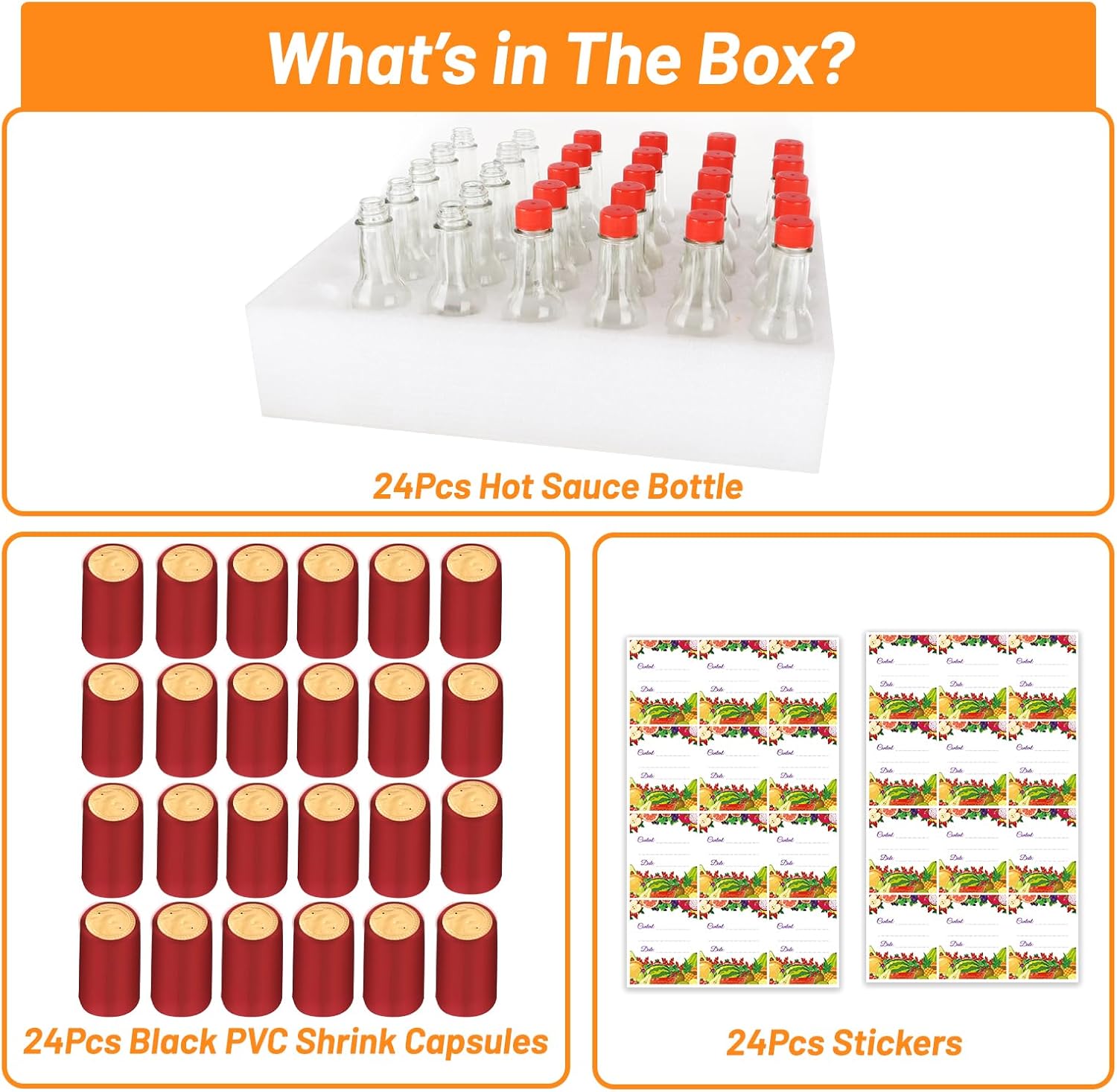 GREAT VALUE SET: Each set includes 24 pack 5oz (150ml) sauce bottles glass with red screw caps,dripper inserts,24 heat shrink capsules,36pcs stickers