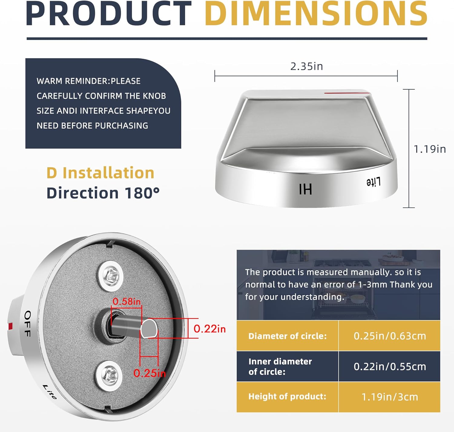 【PRODUCT SIZE】 :Before purchasing gas stove knob replacement parts, please check the stove knob part number or measure the original size, Especially the size of the “D” design, our D port depth is 0.58in diameter 0.25/0.22in. To avoid receiving unsuitable alternatives for stove knobs (see second picture)