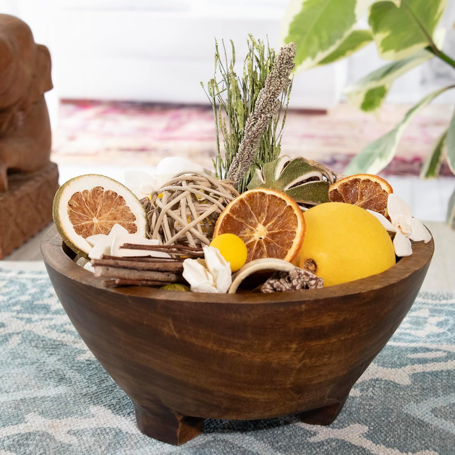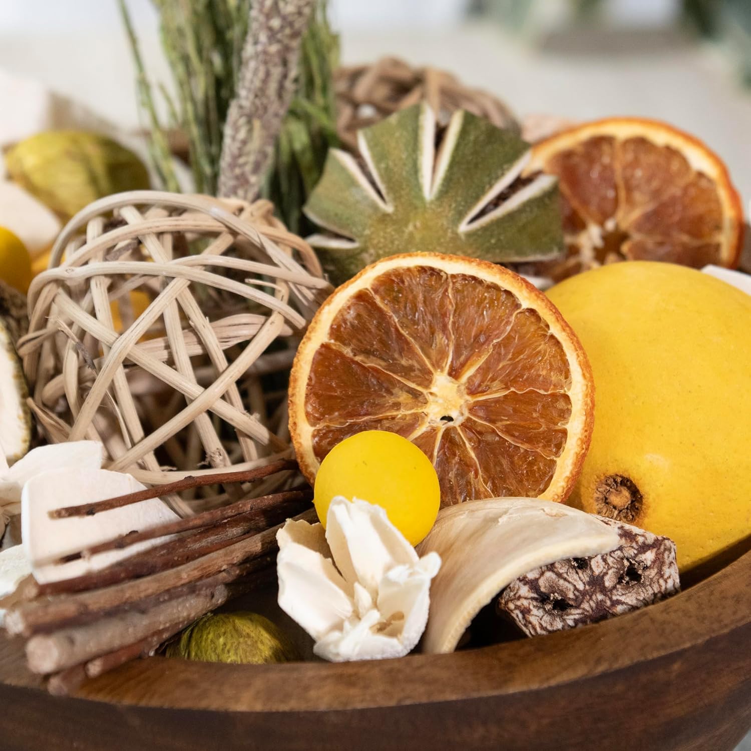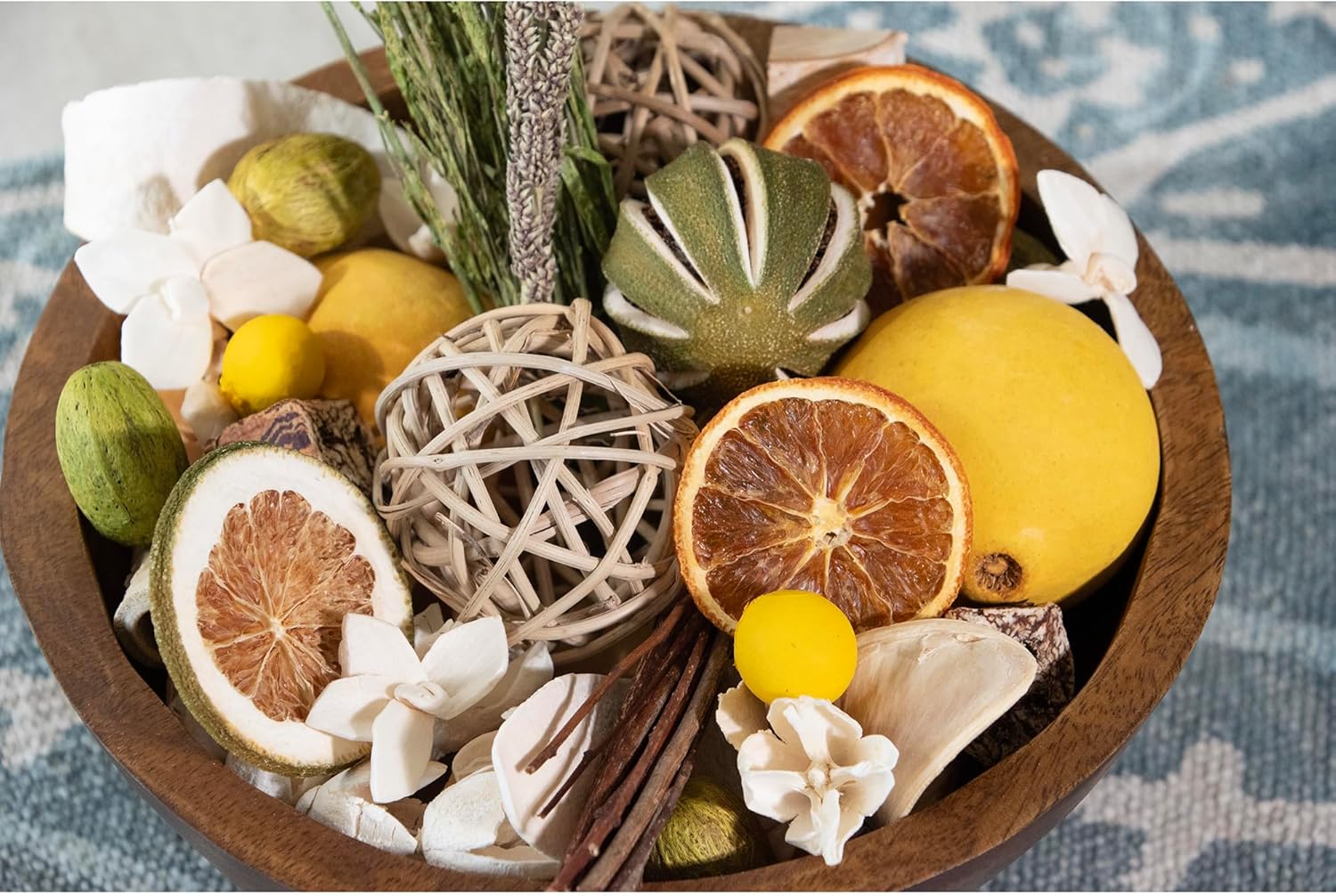 Citrus Verbena Potpourri made with real citrus slices, decorative balls, botanicals and infused with our Citrus Verbena fragrance. Featured above in our ANDALUCA Teak wood 9-10inch round bowl.