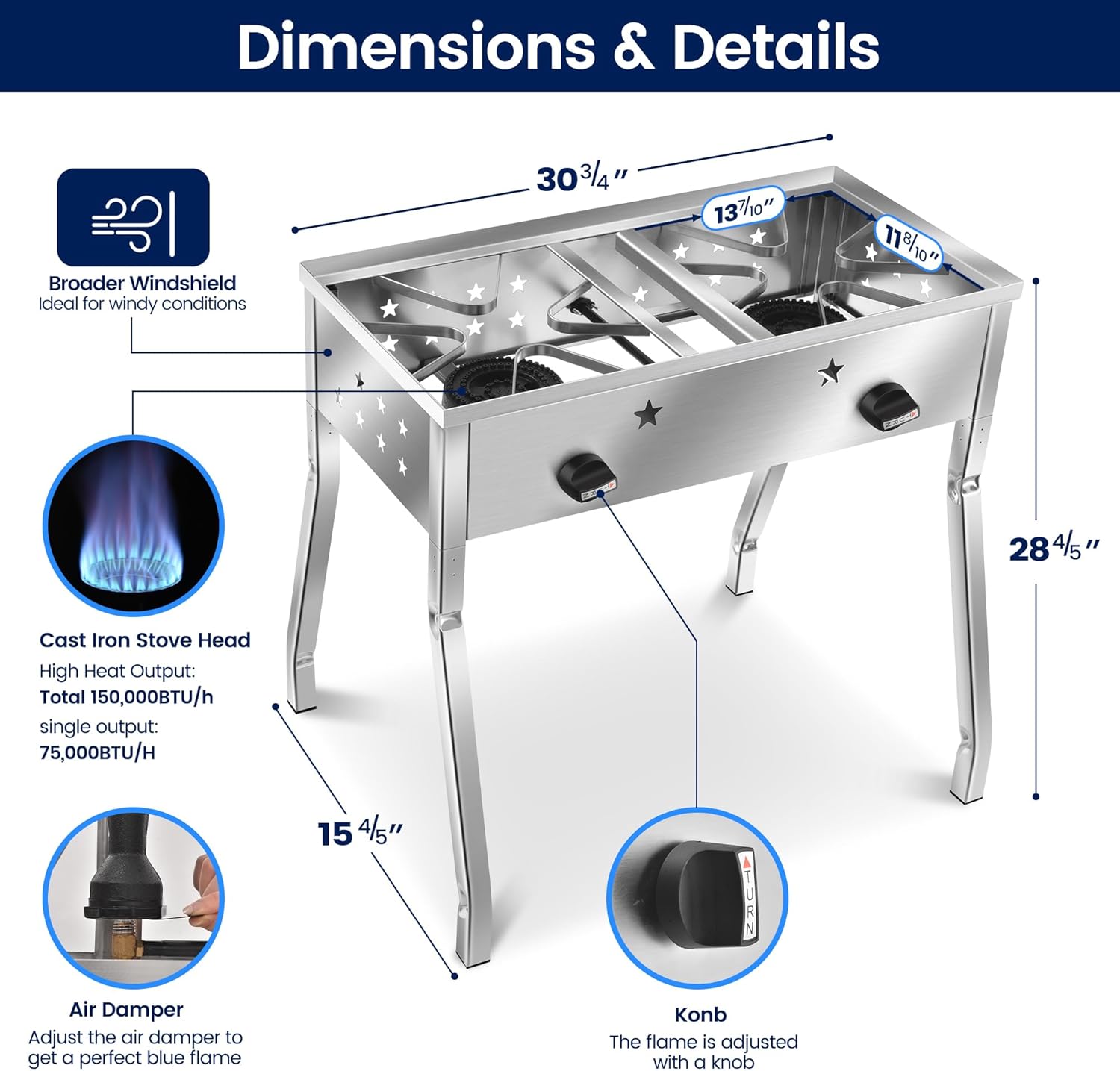 Stable Output Burner:The stable output burner provides adjustable firepower with a high-pressure system, delivering a total of 150,000 BTU/H,for 75,000BTU/H each. Ideal for camping, RV trips, tailgating, and backyard parties.