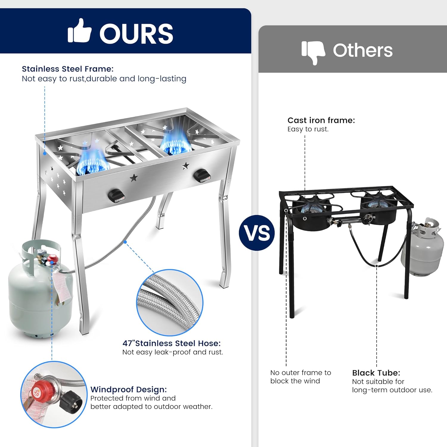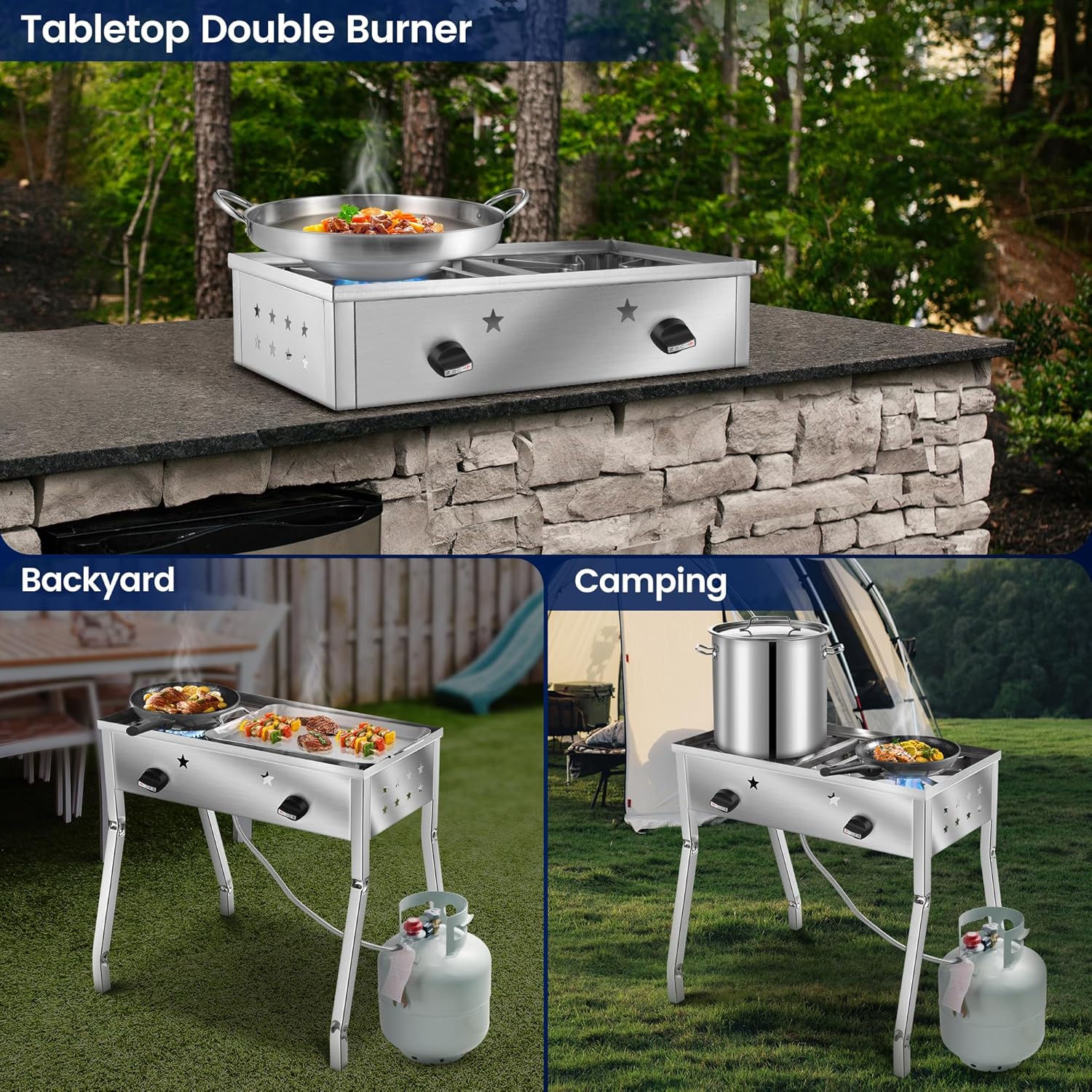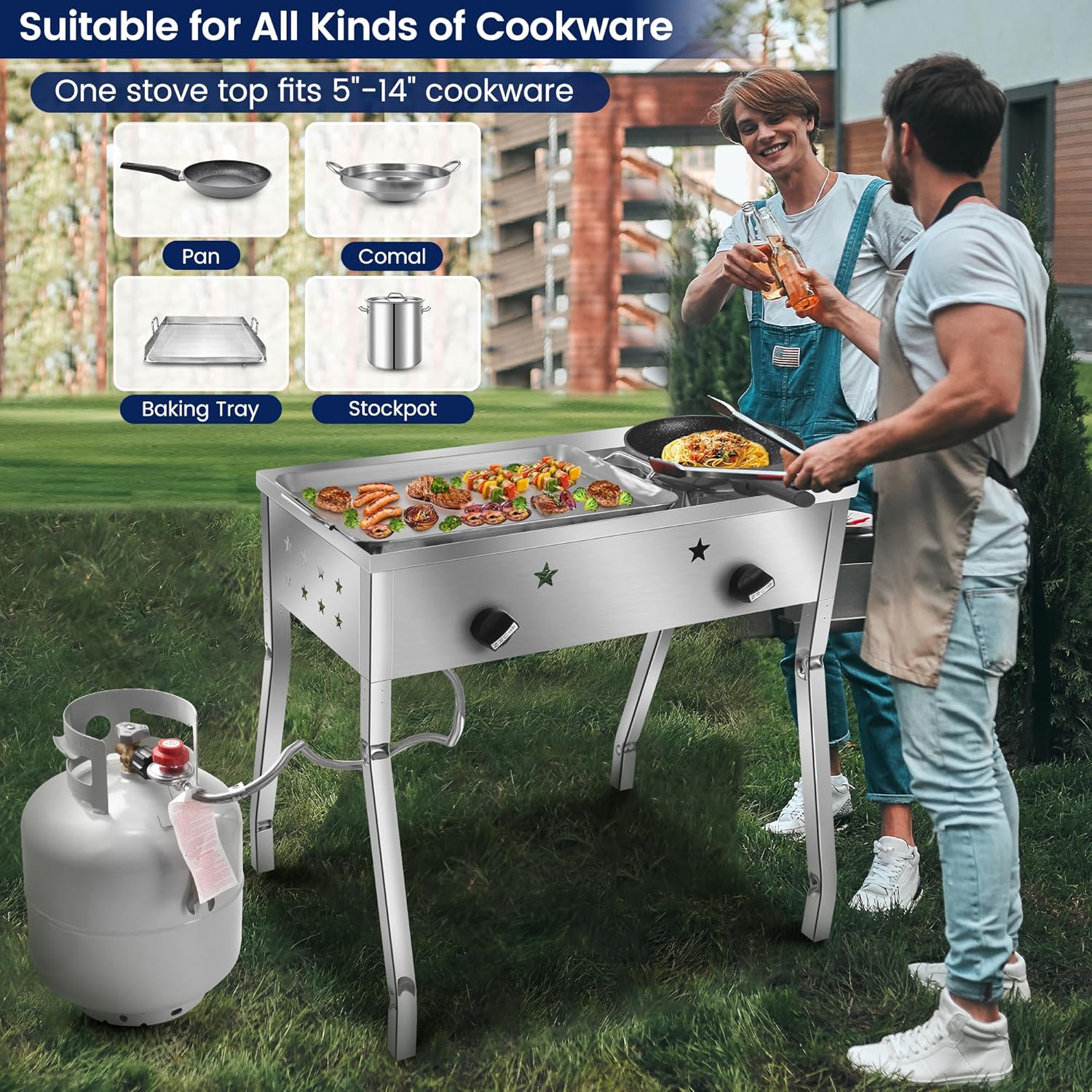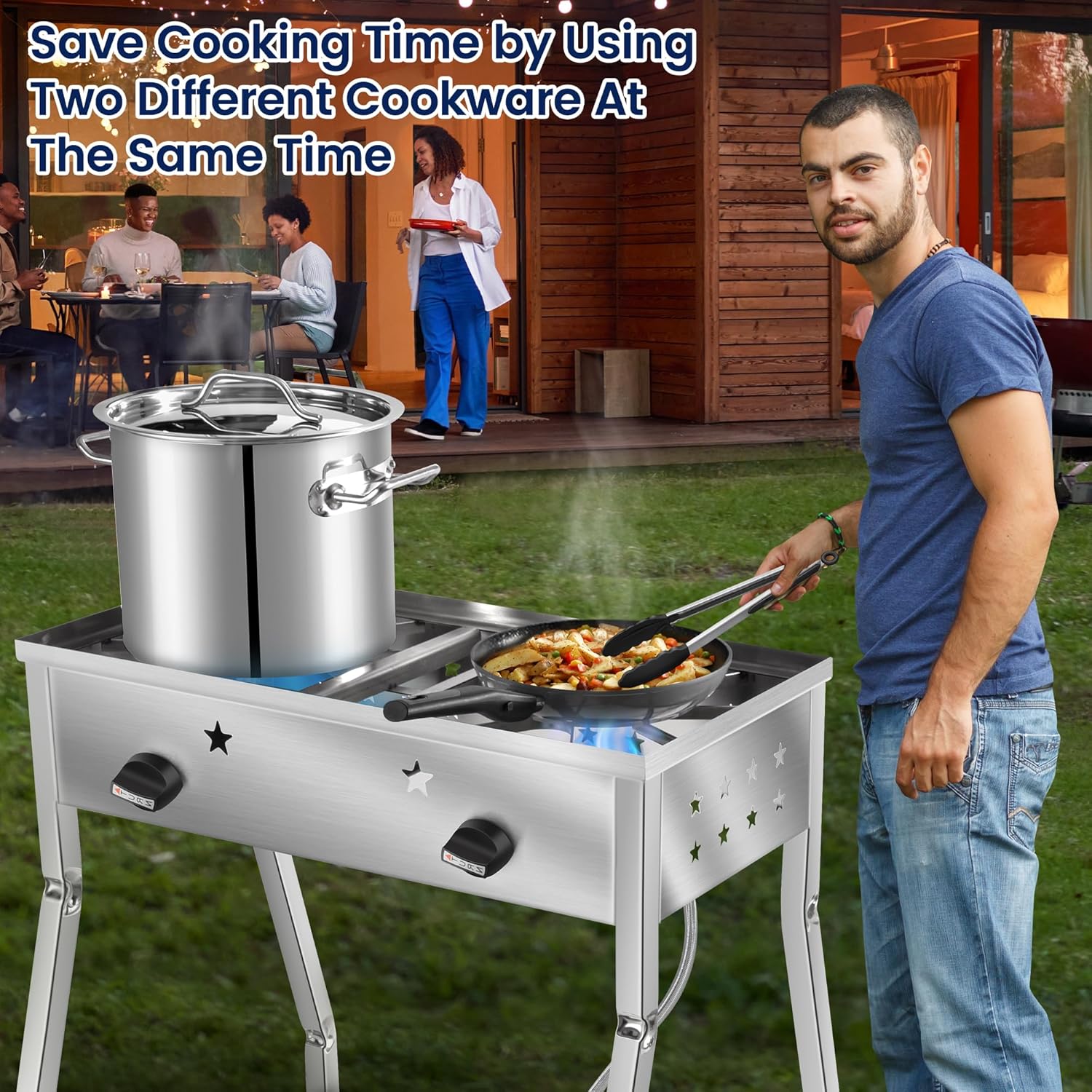 Complete Package: This double propane burner comes with a 47″ stainless steel hose and a 20PSI regulator(gas tank not included), ensuring a stable and reliable flame for all your outdoor cooking needs.