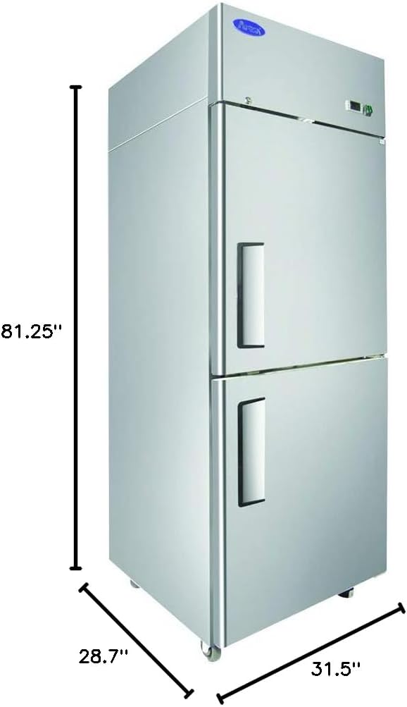 The Atosa Refrigerator is a reach-in, one-section unit with dimensions of 28-3/4″W x 31-1/2″D x 81-1/4″H, providing a capacity of 21.4 cu. ft. This top mount self-contained refrigeration unit features two locking right-hand hinged solid half-doors and digital temperature control, maintaining a temperature range of 33°F to 40°F. It includes three adjustable shelves and interior LED lighting for enhanced visibility. Automatic evaporation and air defrost ensure efficient operation, while the stainless steel interior and exterior, along with a galvanized steel back, provide durability. Equipped with 4″ casters for mobility, it uses R290 Hydrocarbon refrigerant and operates on a 1/6 HP compressor at 115v/60/1-ph with a 4 amp draw, featuring a cord with NEMA 5-15P.