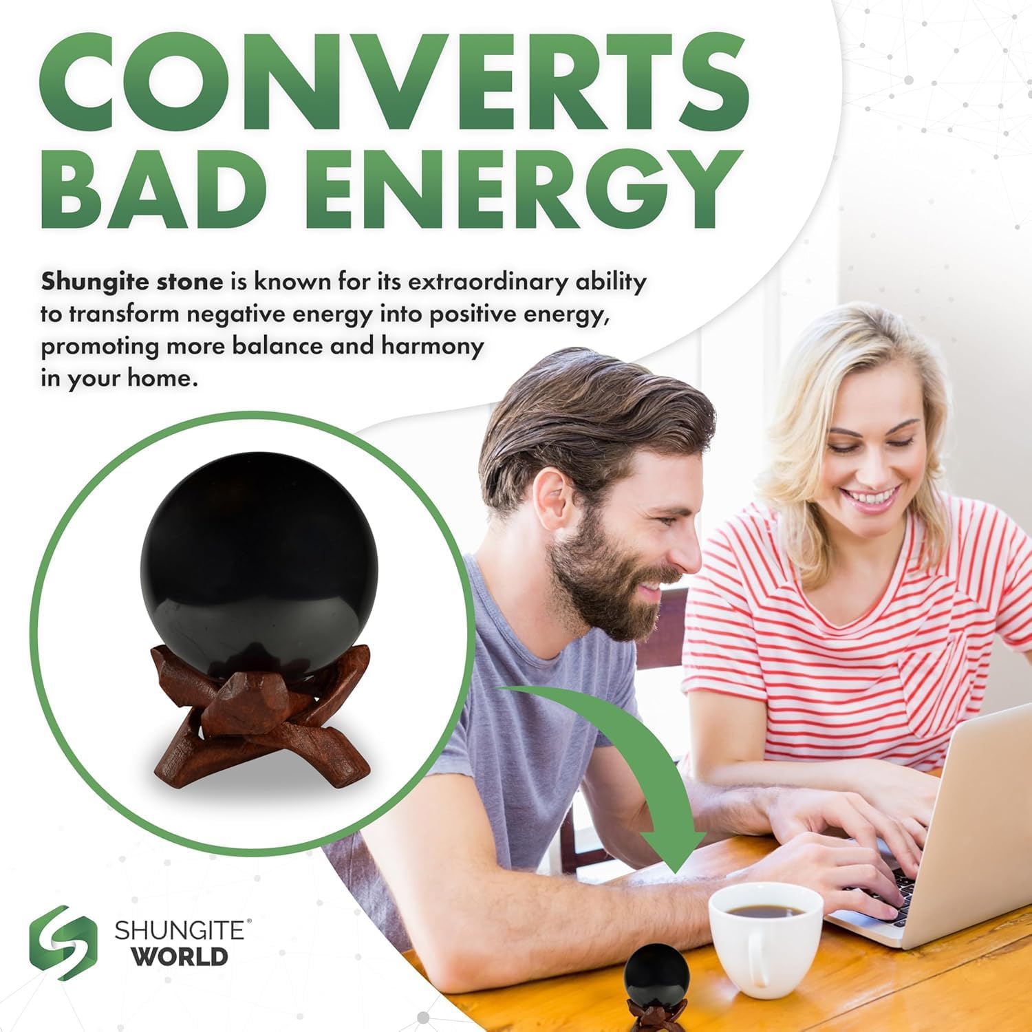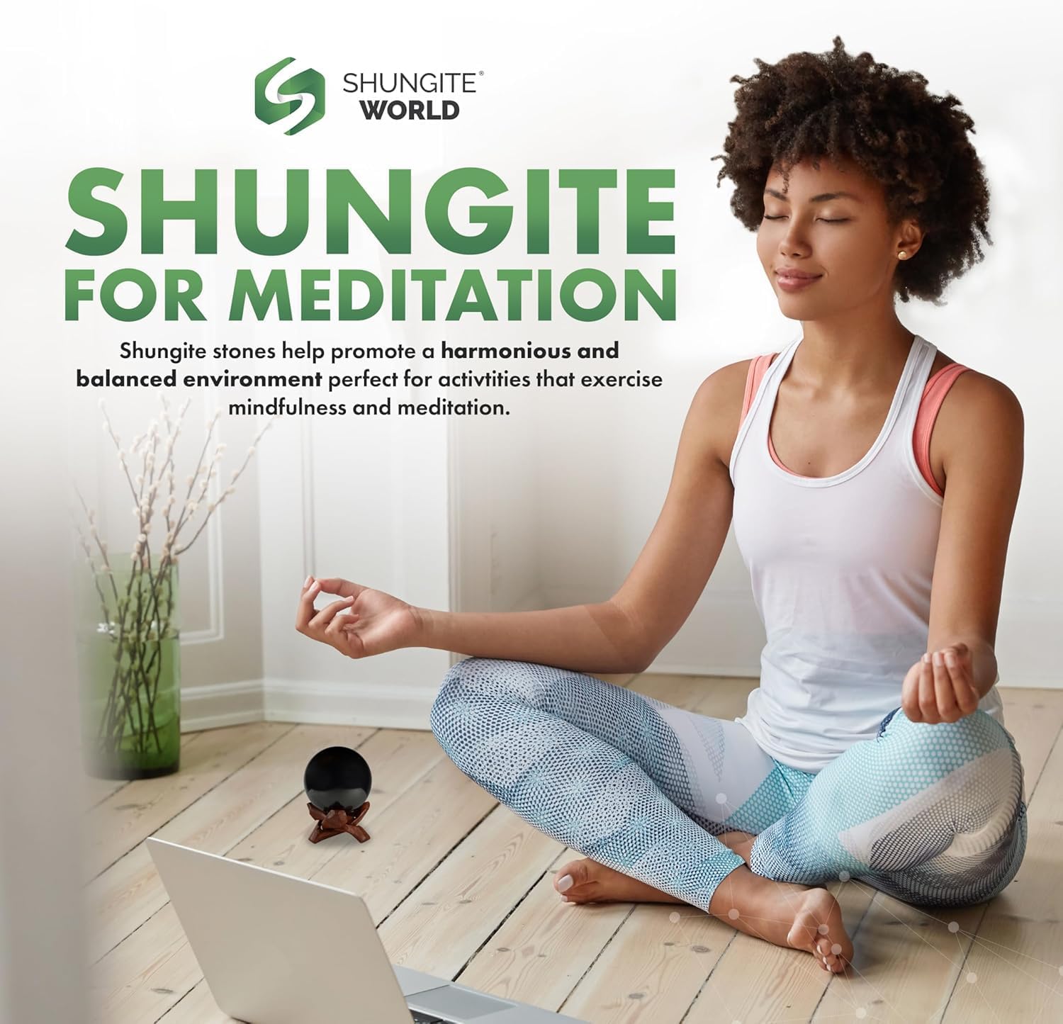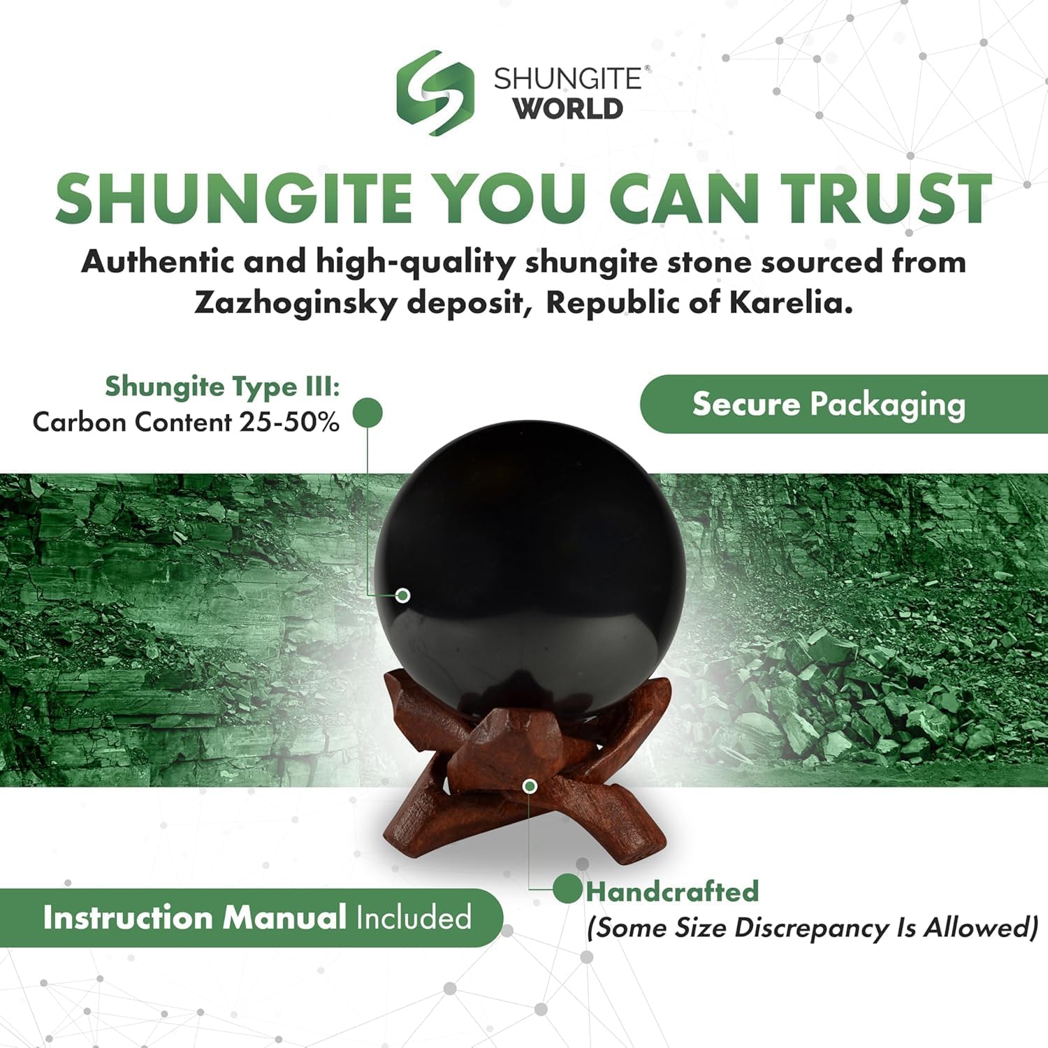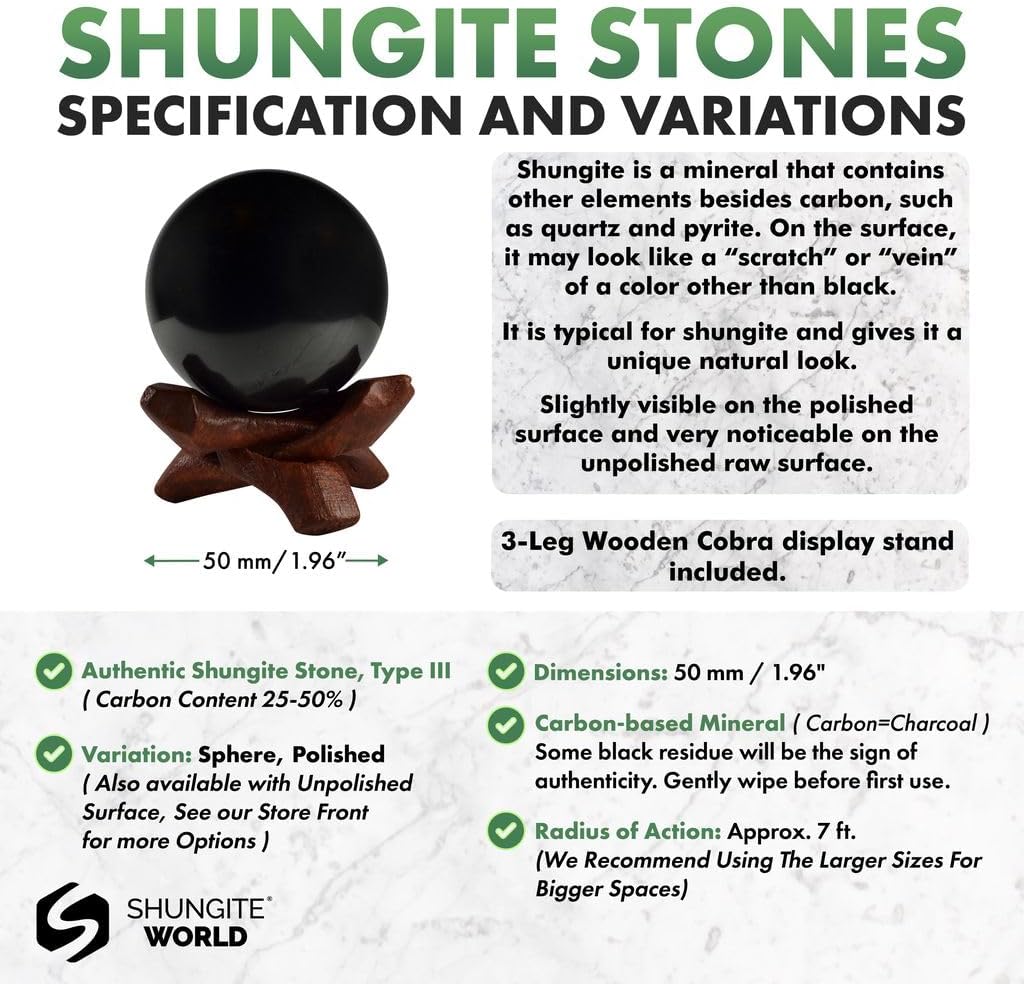 Shungite Sphere: Polished 50 mm / 1.96″ Radius of action – 7 ft; Crafted from natural solid Type III Shungite rocks with carbon content 25-50%; Best way to discovering and understanding ancient stone’s remarkable potential is to feel it yourself
