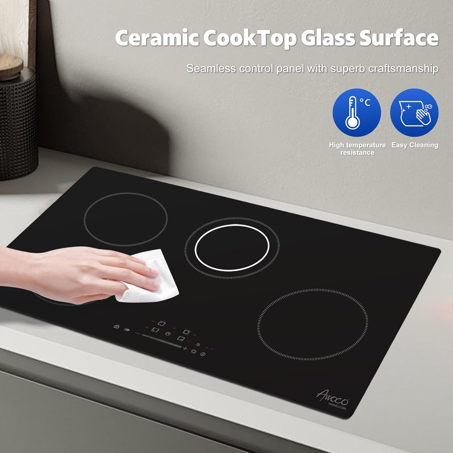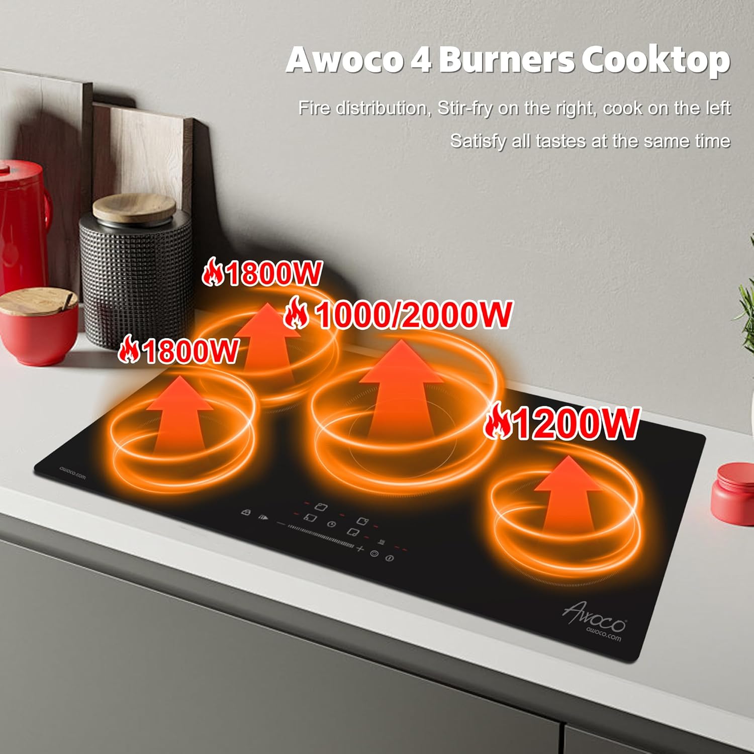 Awoco 30-Inch Ceramic Cooktop, 6600W Electric Stove with 4 Burners with hard wire, 9 Power Levels Digital Timer Child Lock, Residual Heat Indicator, Automatic Shut-Off Easy Clean Touch Panel, 220-240V