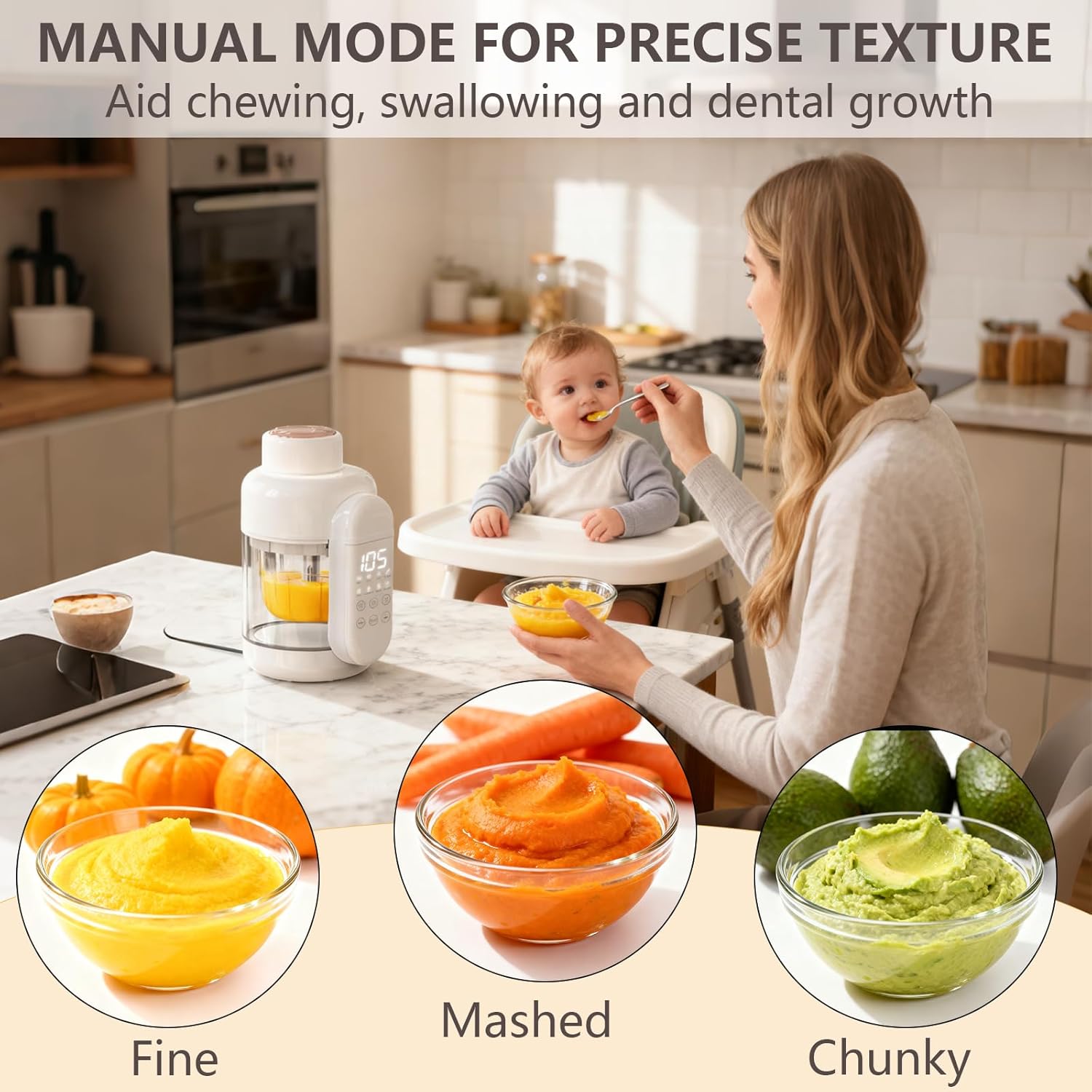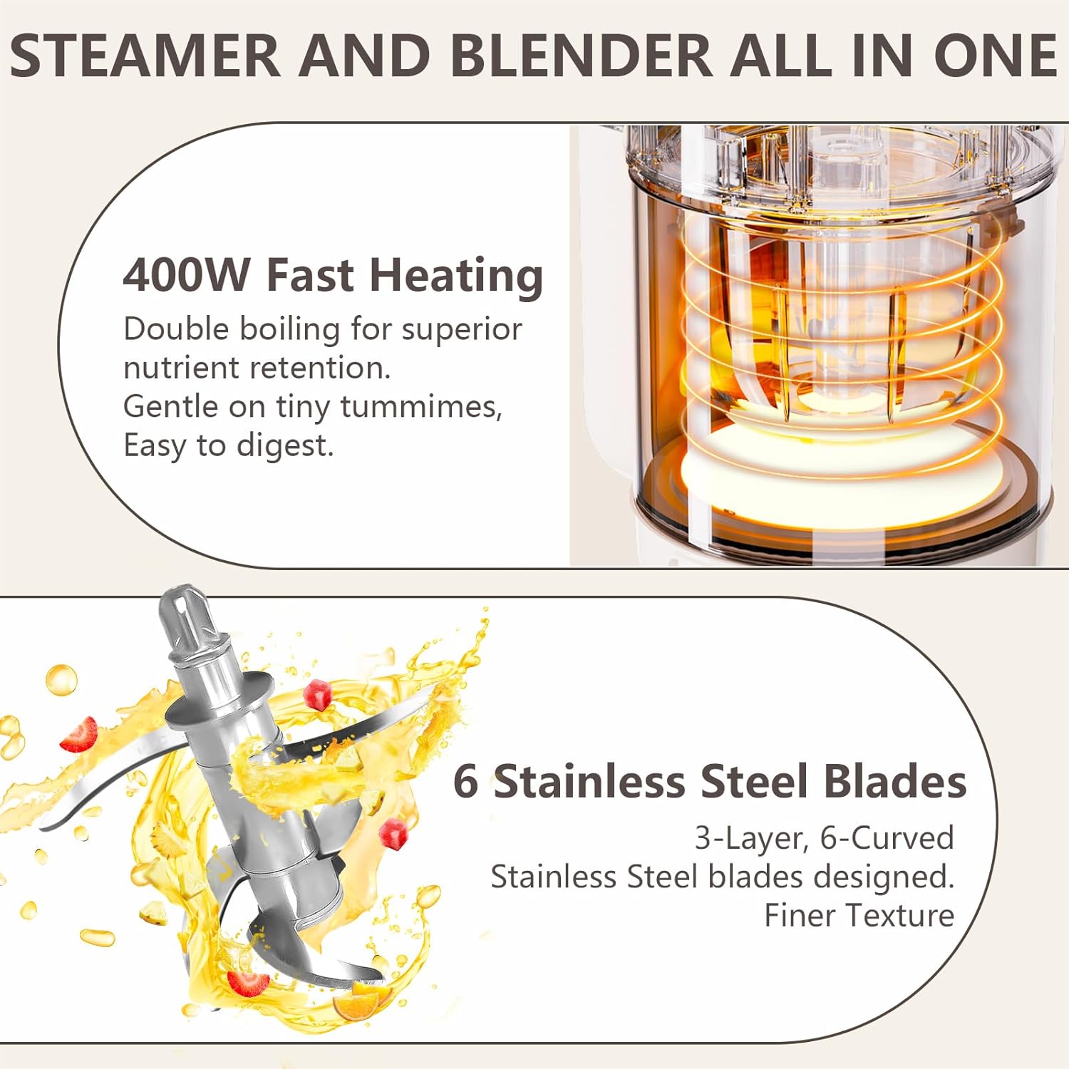 【Easy to Clean】: Food maker has self clean mode, make it easy to clean. Each component of baby blender is easily detachable for swift cleaning, and dishwaher safe, while the included cleaning brush ensures no crevice is left untouched. Non-stick coating ensures no more limescale.