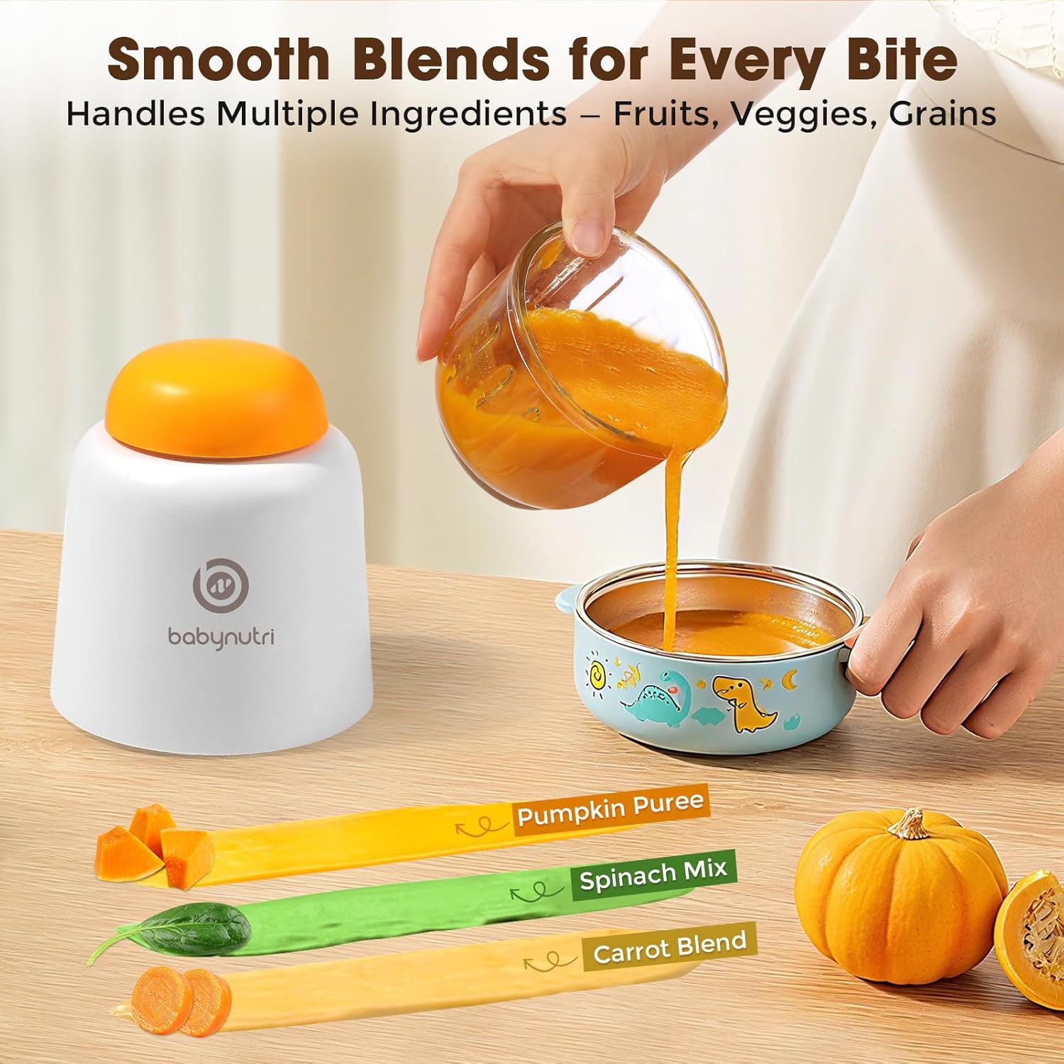 【Powerful Stainless Steel Blades】Equipped with high-quality stainless steel blades, BabyNutri blends fruits, veggies, and meats into smooth purees in seconds—perfect for all stages of baby feeding.