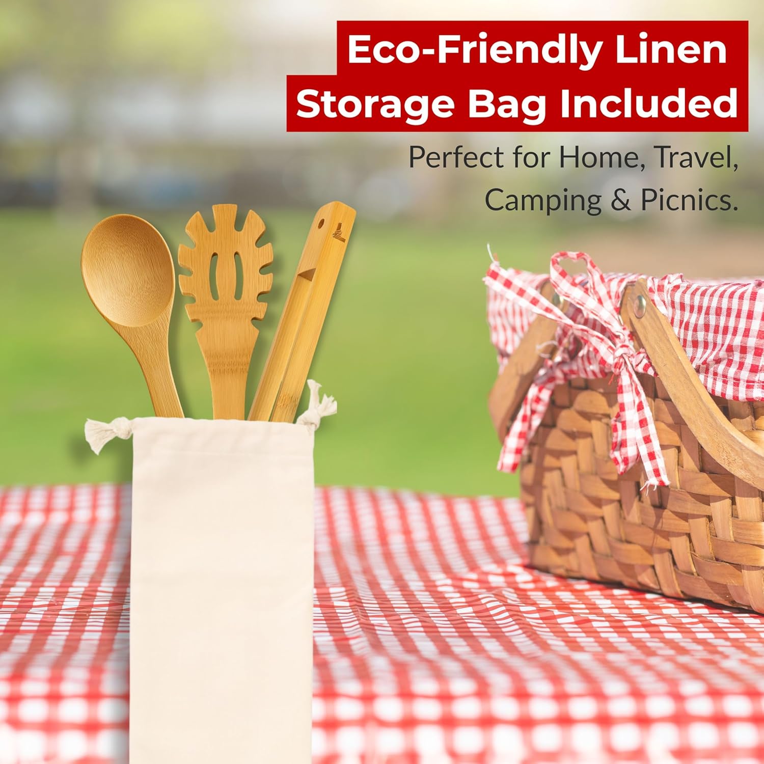 7 Essential Cooking Tools – Includes solid spoon, slotted spoon, flat spatula, slotted spatula/turner, pasta server, kitchen tongs, and a bamboo scrub brush. Comes with a reusable linen storage bag.