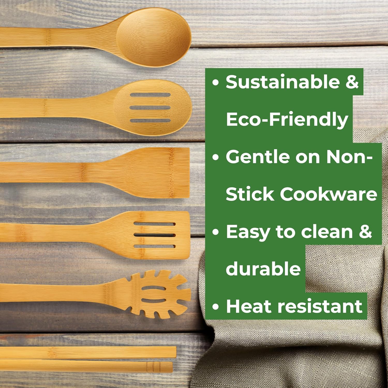 Bamboo Kitchen Utensil Set, 7-Pieces Natural Cooking Utensils for Nonstick Cookware, Eco-Friendly Wooden Spoons and Spatulas for Cooking