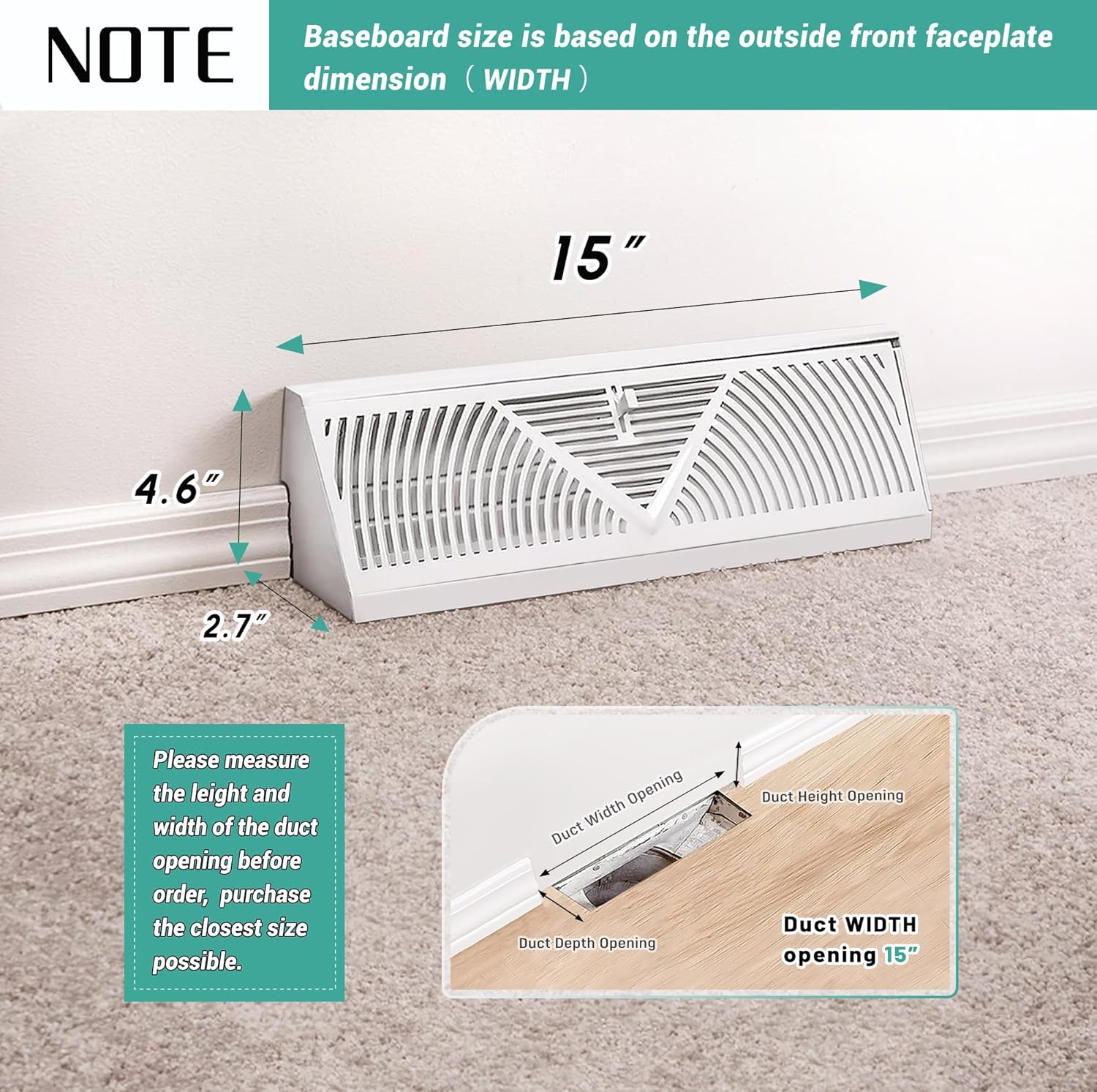 1.Baseboard register 15 inch – Designed to fit standard board diffuser 15 inch HVAC openings.
