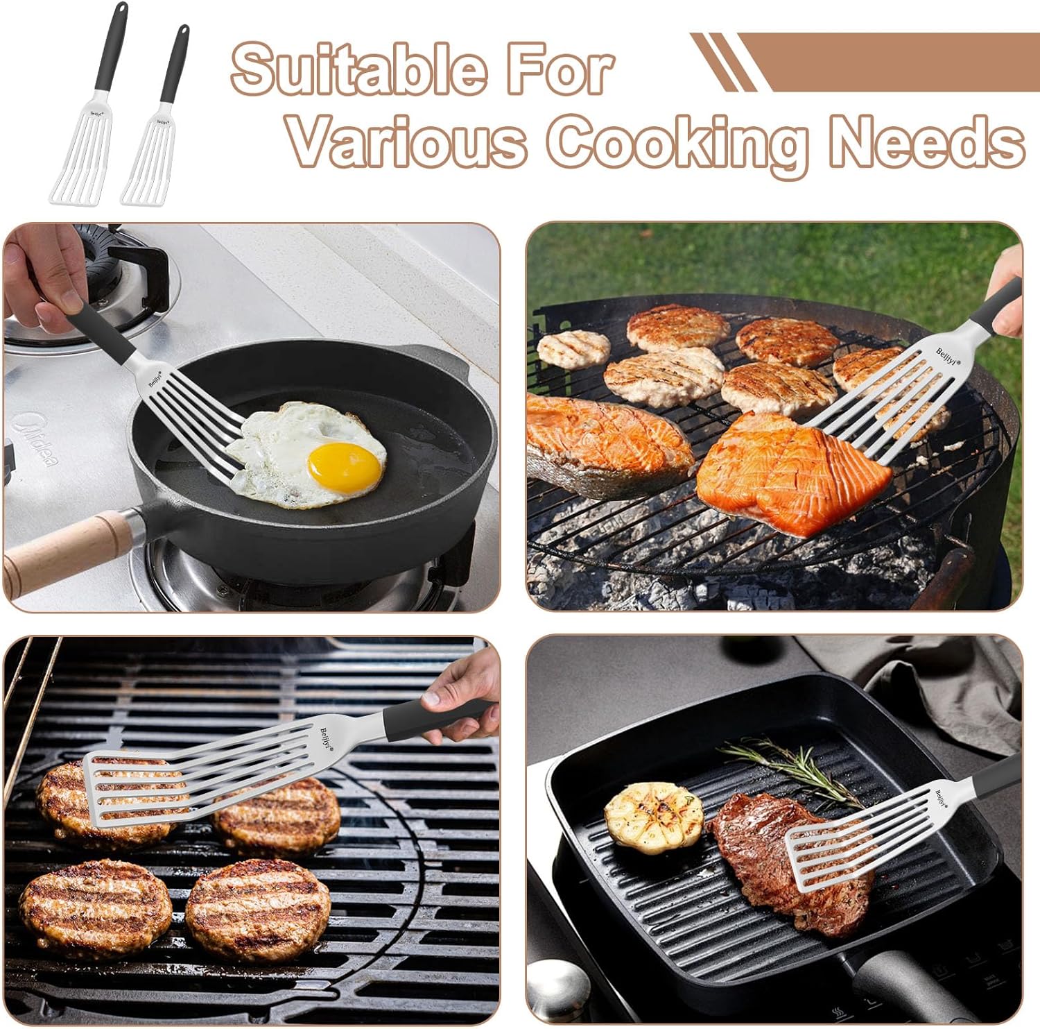 Applicable: These metal spatulas are essential stainless steel cooking utensils for kitchen use and grilling. Suitable for cast iron skillet and any grilling surface. These dishwasher-safe spatulas make food handling effortless. The larger size fish turner spatula is perfect for substantial items, while the smaller one offers better control for precise tasks. Their slotted design allows excess oil and liquids to drain efficiently, helping you create perfectly cooked dishes every time.
