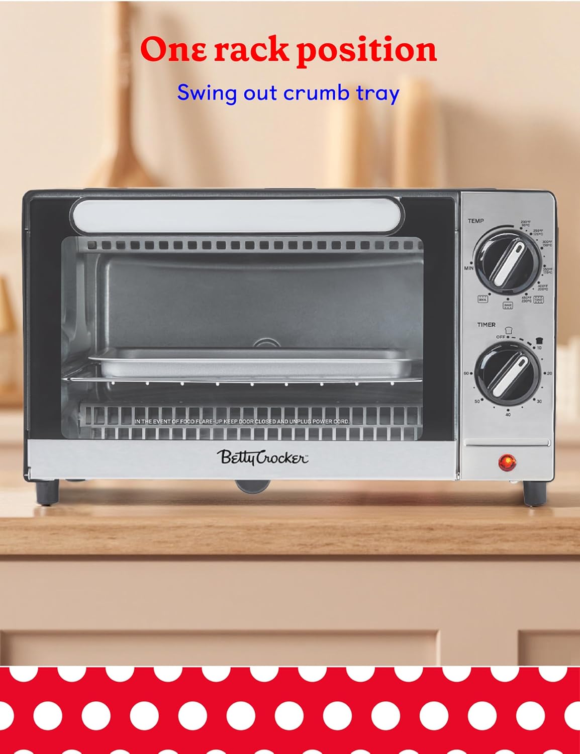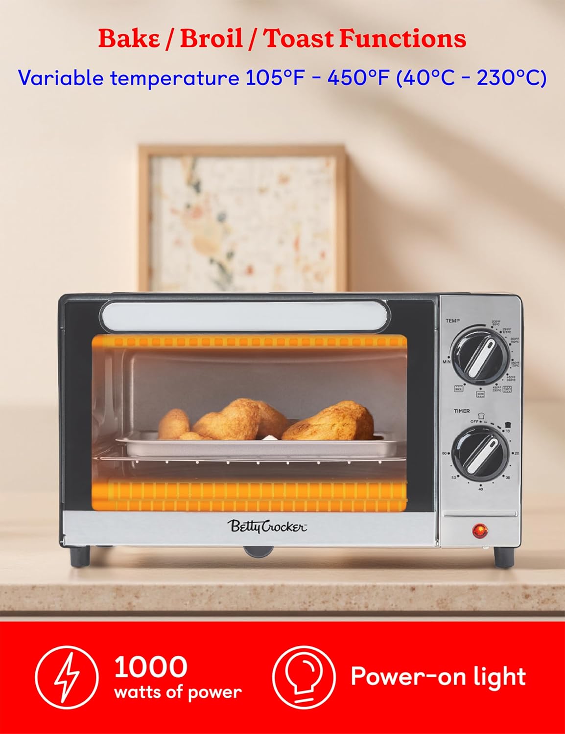 More Than Just Toast! This Betty Crocker Toaster Oven is compact but powerful enough for baking, broiling and toasting. With temperature control up to 450°F, easily heat up toast, pizza, bagels, paninis, wings and more.