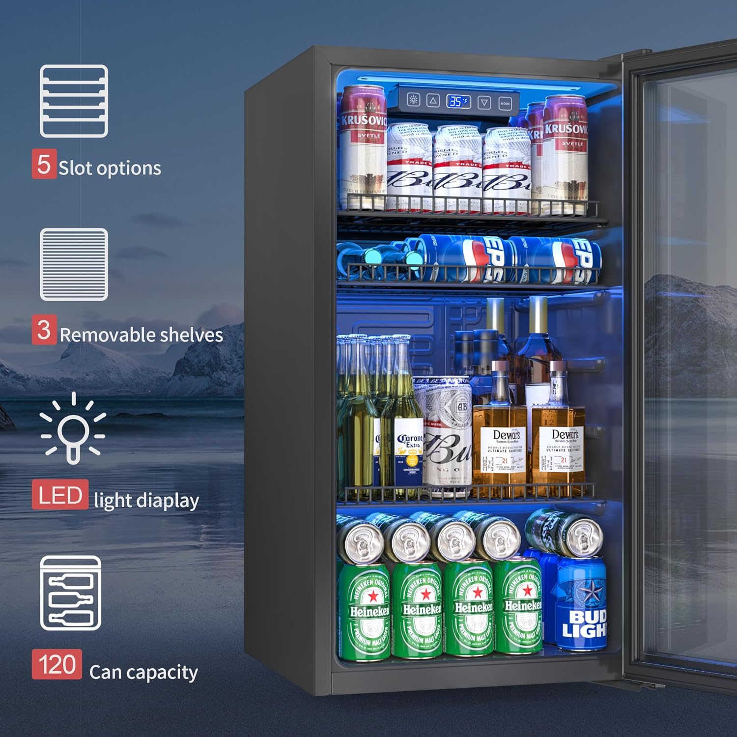 𝗦𝗺𝗮𝗿𝘁 𝗧𝗲𝗺𝗽𝗲𝗿𝗮𝘁𝘂𝗿𝗲 𝗖𝗼𝗻𝘁𝗿𝗼𝗹:This smart beverage refrigerator features an intuitive Touch Temperature Control system with a clear Digital Display, allowing you to easily customize the temperature to suit your needs. Whether you’re chilling sodas, beers, or aging fine wines, you can maintain an ideal temperature range from 35°F to 65°F. The efficient compressor cooling system provides quick cooling with minimal noise, ensuring a smooth and enjoyable drinking experience.