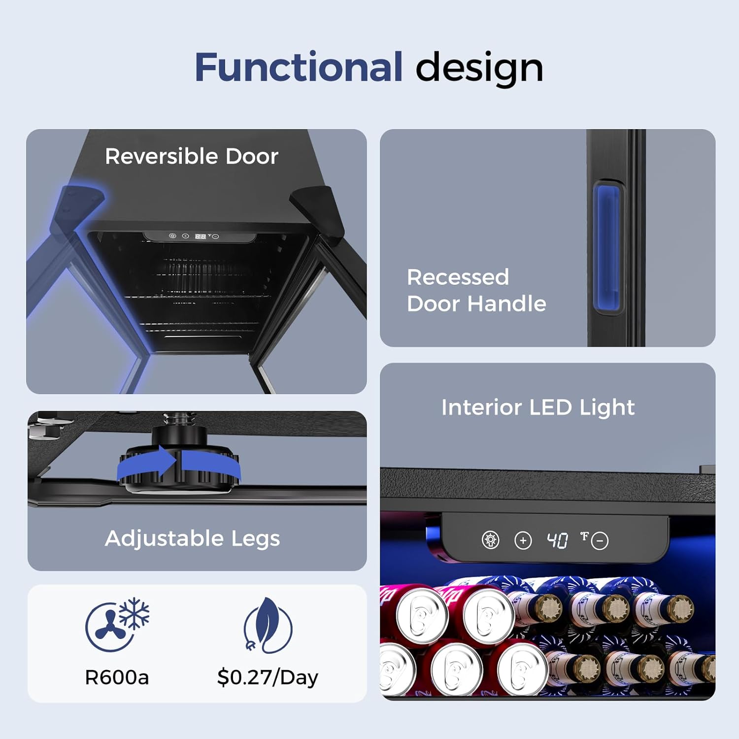 Premium Design & Aesthetics: The double-pane glass door with LOW-E coating not only enhances insulation but also showcases your collection elegantly. The reversible door and adjustable leveling legs provide unmatched flexibility for installation. The soft blue LED lighting creates an inviting ambiance. It seamlessly integrates into your living area, allowing you to transform any corner into a beverage oasis.