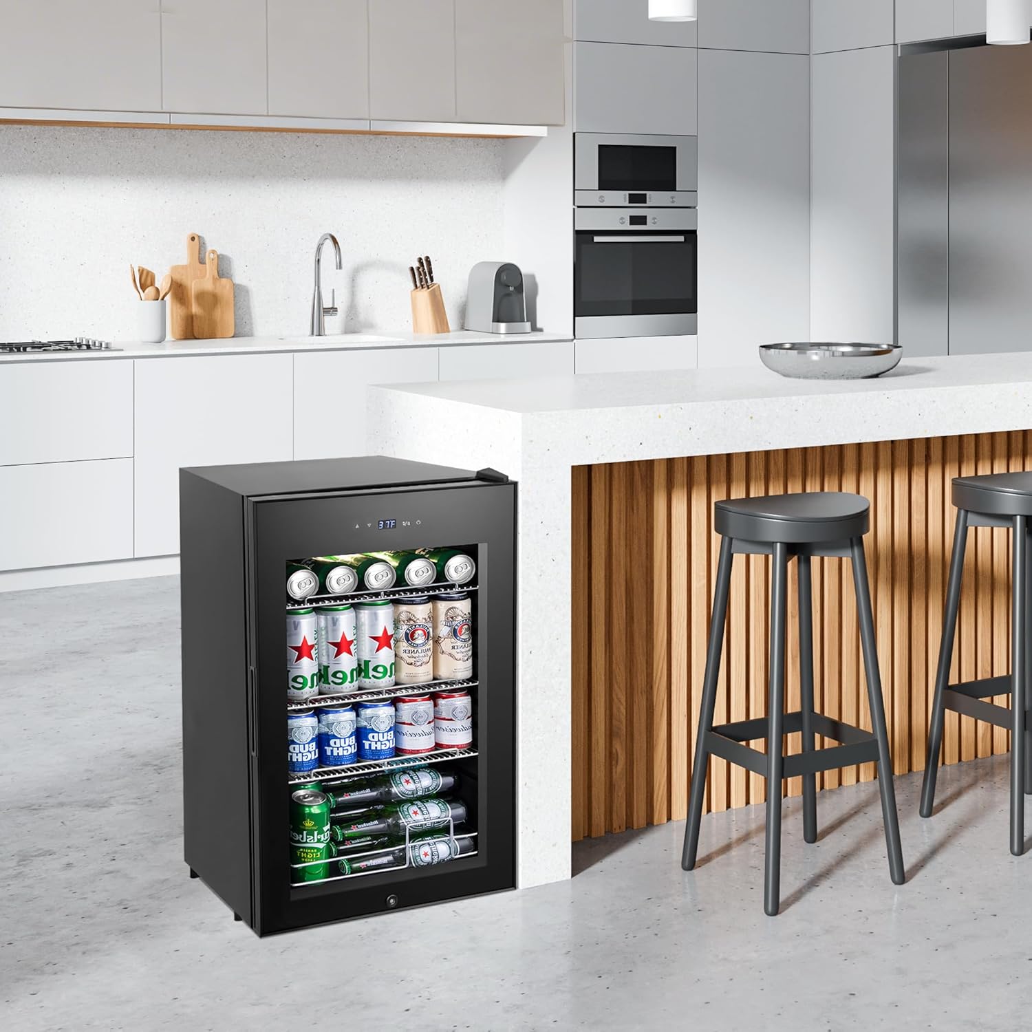 Large Capacity: The counter beverage fridge can hold up to 120 standard beer cans; 3 removable shelves and a grid divide the storage space into 4 different sizes areas; Such a compact design can satisfy you to store different sizes of drinks