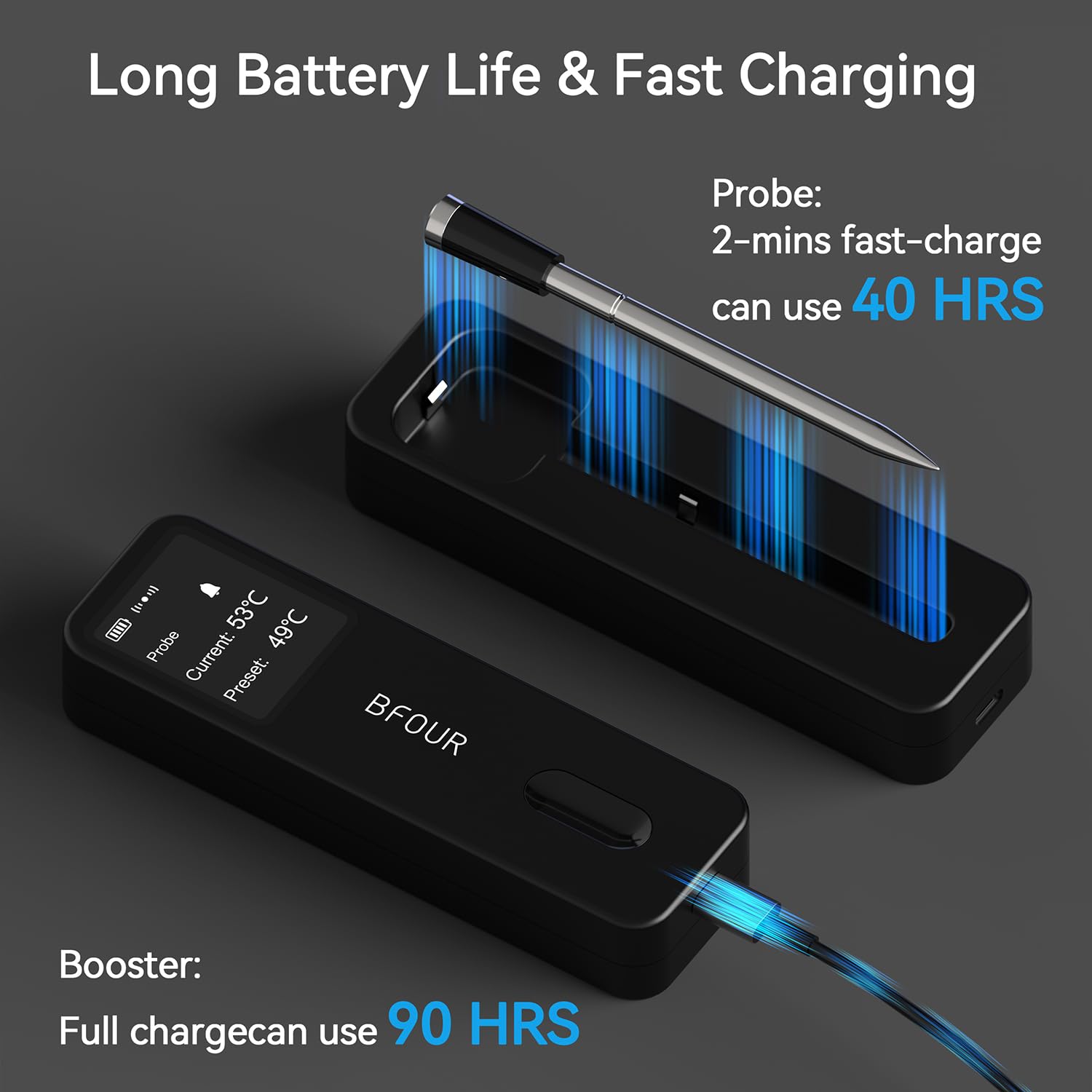 Long Battery Life & Fast Charge: Fully charge the booster in 3 hours for over 90 hours of continuous use, and quickly charge the probe in 2 minutes for over 40 hours of continuous use; this bbq thermometer is suitable for all-day cooking and does not require frequent recharging, making it a reliable companion for home cooking and traveling barbecues