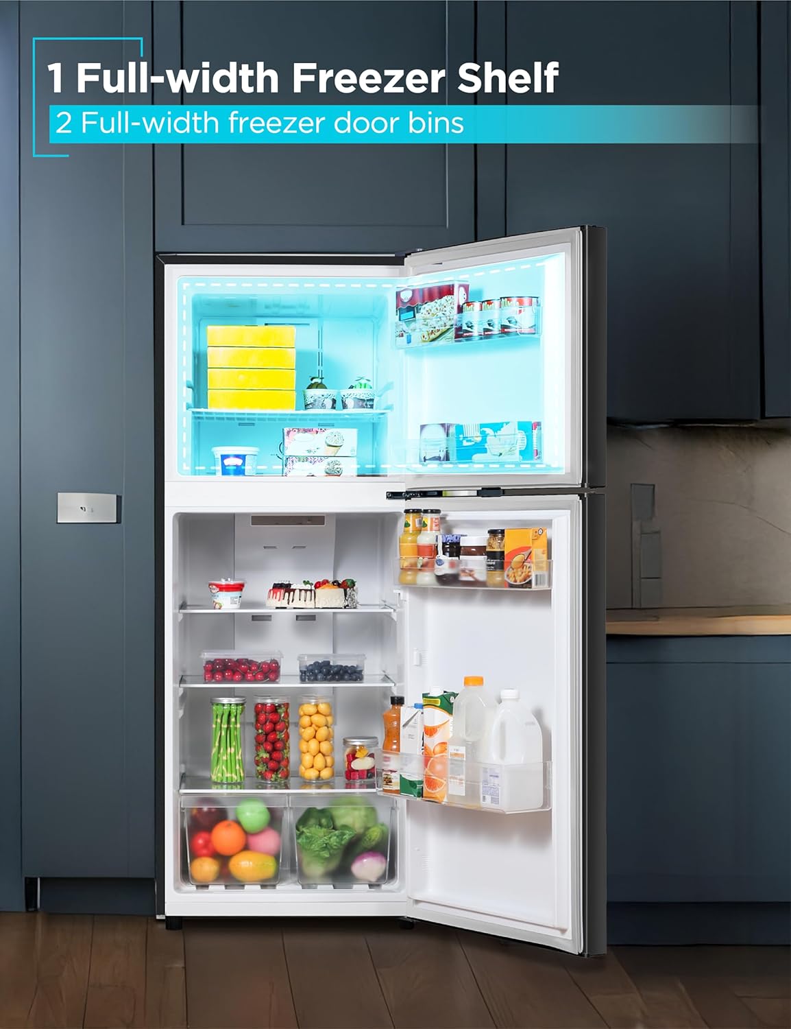 Spacious 12.1 Cu. Ft. Capacity: This full size refrigerator with freezer provides ample space for your fresh and frozen foods. Top freezer refrigerator is ideal for kitchens in homes and apartments