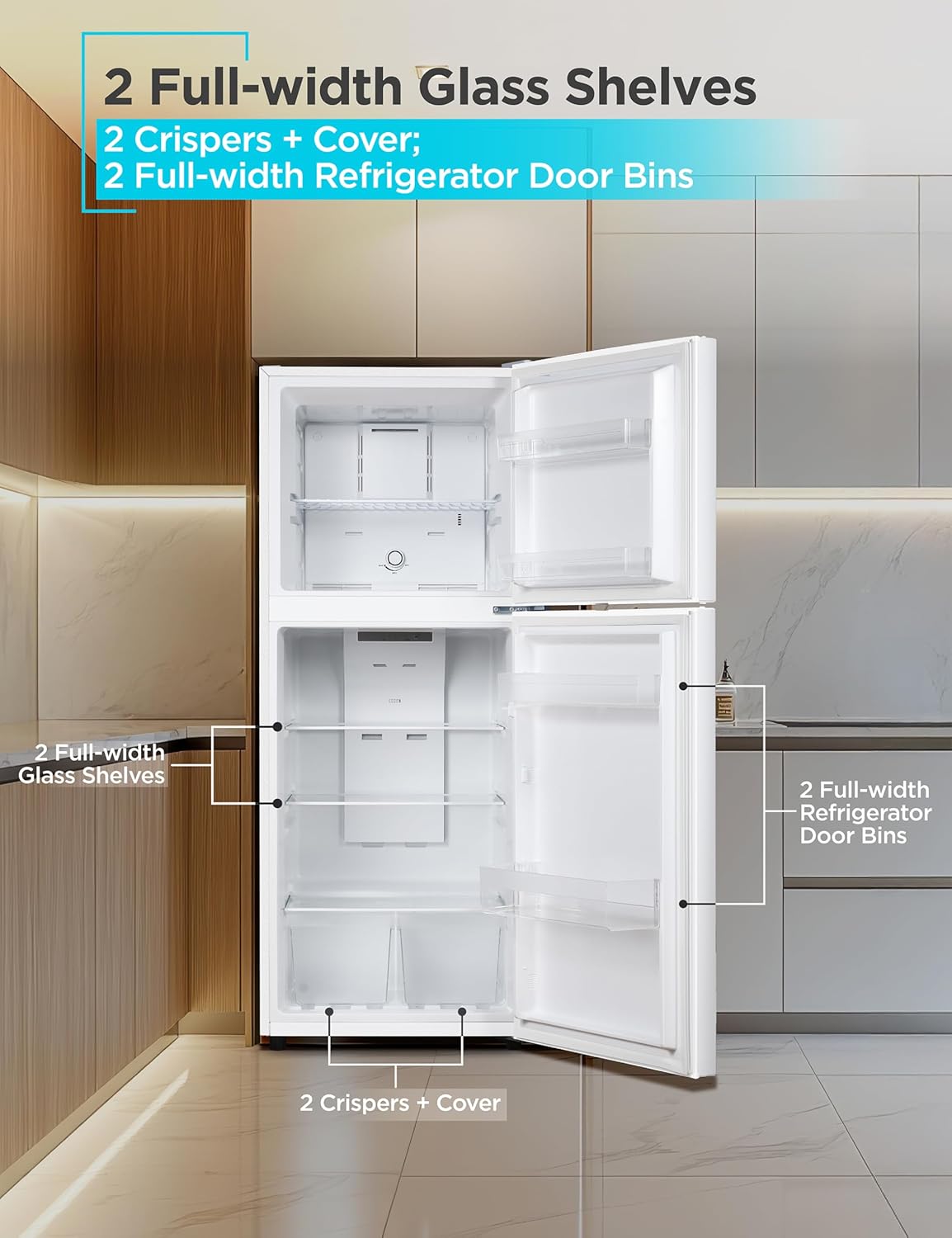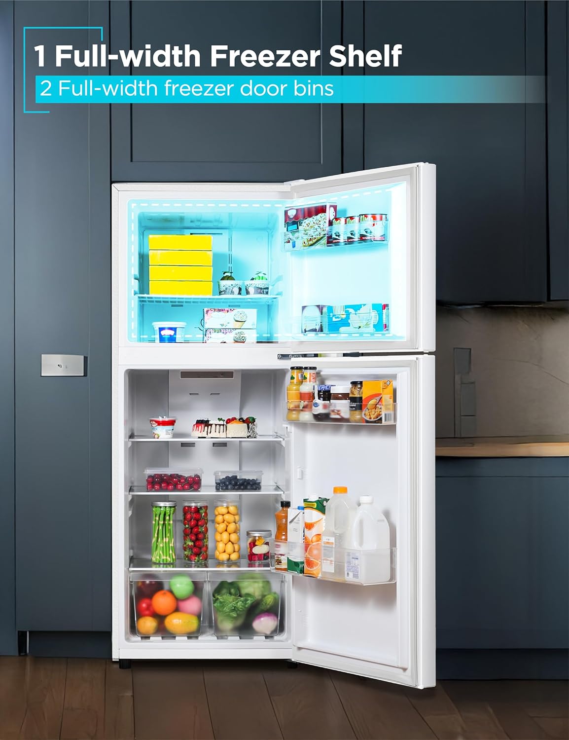 Spacious 12.1 Cu. Ft. Capacity: This full size refrigerator with freezer provides ample space for your fresh and frozen foods. Top freezer refrigerator is ideal for kitchens in homes and apartments