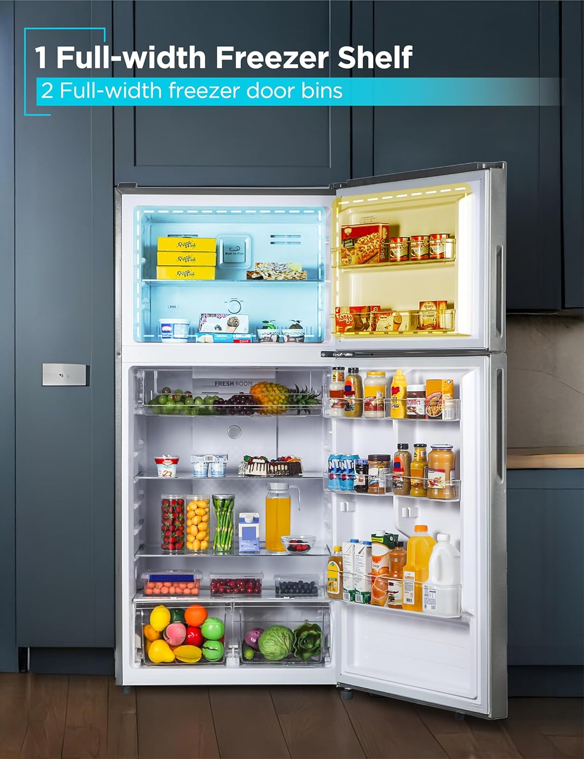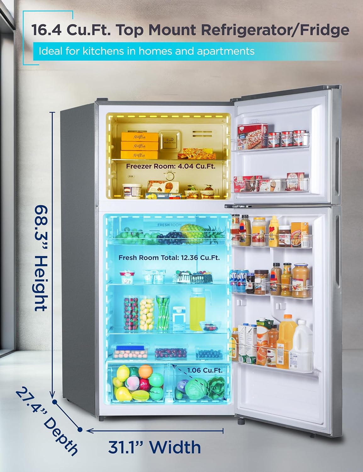 Spacious 16.4 Cu. Ft. Capacity: This full size refrigerator with freezer provides ample space for your fresh and frozen foods. Top freezer refrigerator is ideal for kitchens in homes and apartments