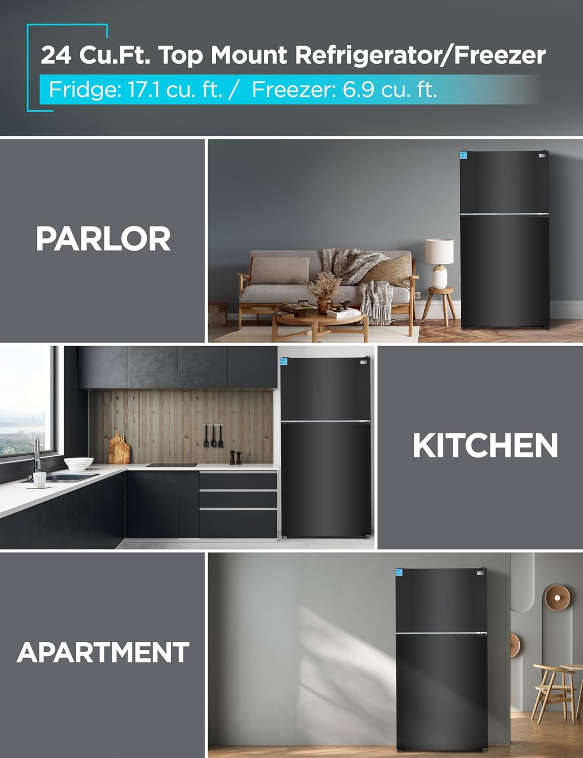 Spacious 24 Cu. Ft. Capacity: This full size refrigerator with freezer provides ample space for your fresh and frozen foods. Top freezer refrigerator is ideal for kitchens in homes and apartments