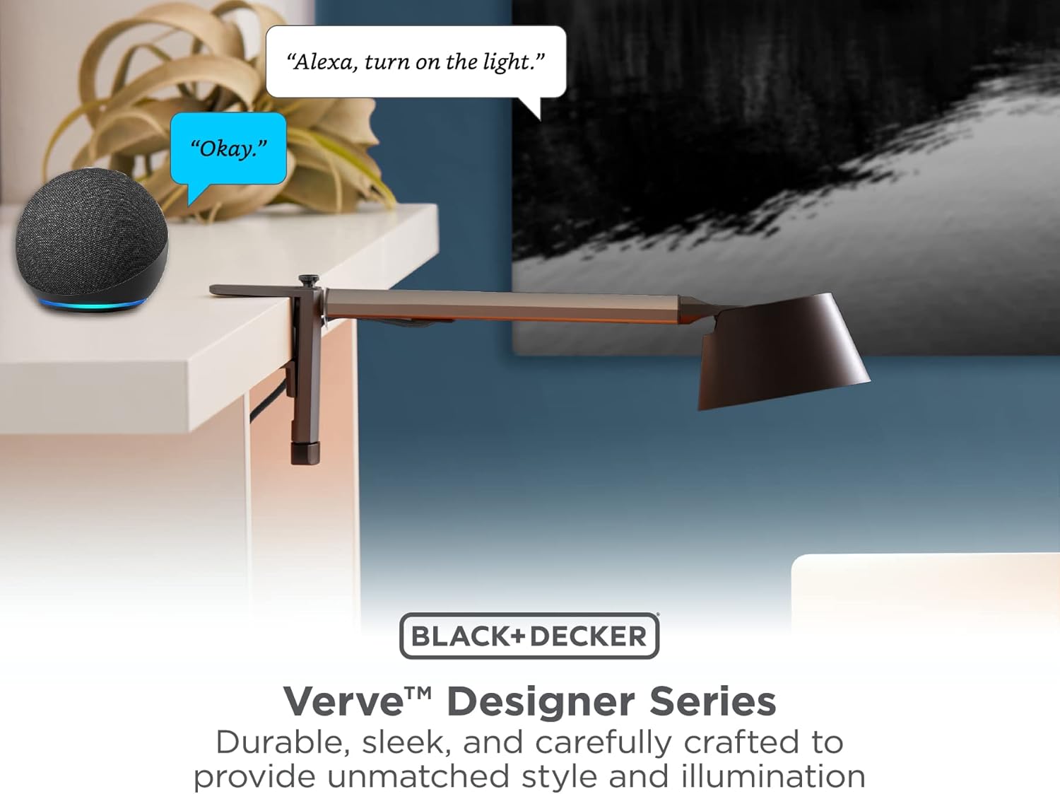 Durable, sleek, and carefully crafted with anodized aluminum beams for premium strength and durability, our Verve Designer series offers a range of models and options for work, play, and relaxation. Brilliant design meets convenient control with our BLACK+DECKER Smart Designer Desk Lamp with Clamp Base that’s easy to set up, delightful to customize, and seamlessly integrates with the Amazon Alexa eco-system. Easily bring the light to your workspace with the simple tap of an app or voice command. With a native connection to the Amazon Alexa eco-system, our lights are surprisingly simple to set up, use, and integrate into your daily routines; no third-party app required. Featuring a unique, 2-in-1 design, this sleek light can be secured to vertical or horizontal surfaces up to 3” thick, making it an ideal accent for shelves, headboards, cubicle walls, and more. With three points of adjustability on the lamp, its design has been crafted for ultimate customization, no matter where you need light. And, with endless controls and modes, set the scene for any occasion: wake and sleep with your body’s natural circadian rhythm, work with true white lighting, and unwind to a spectrum of 16 million colors.