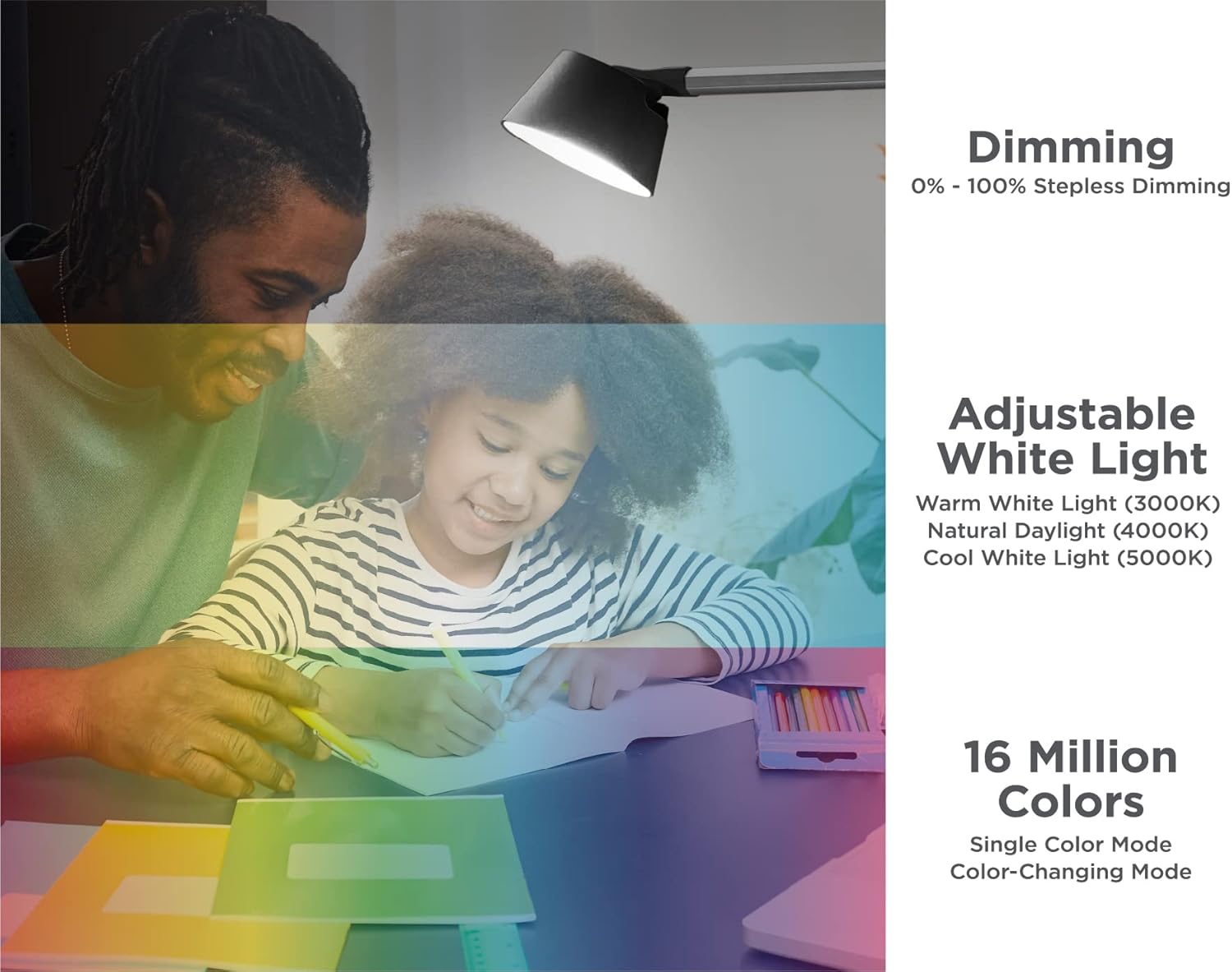 Adjustable CCT: Three adjustable color temperature modes for relaxing, reading and tasks (3000K, 4000K, 6000K) with 10 stepless dimming levels and glare-free illumination