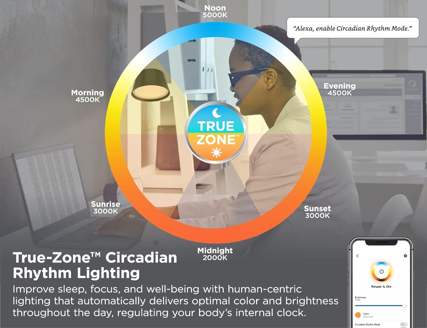 Circadian Rhythm App Mode: Lighting color and brightness that automatically adjusts based on your local time to maximize daytime productivity and help with your body’s natural sleep to wake cycle