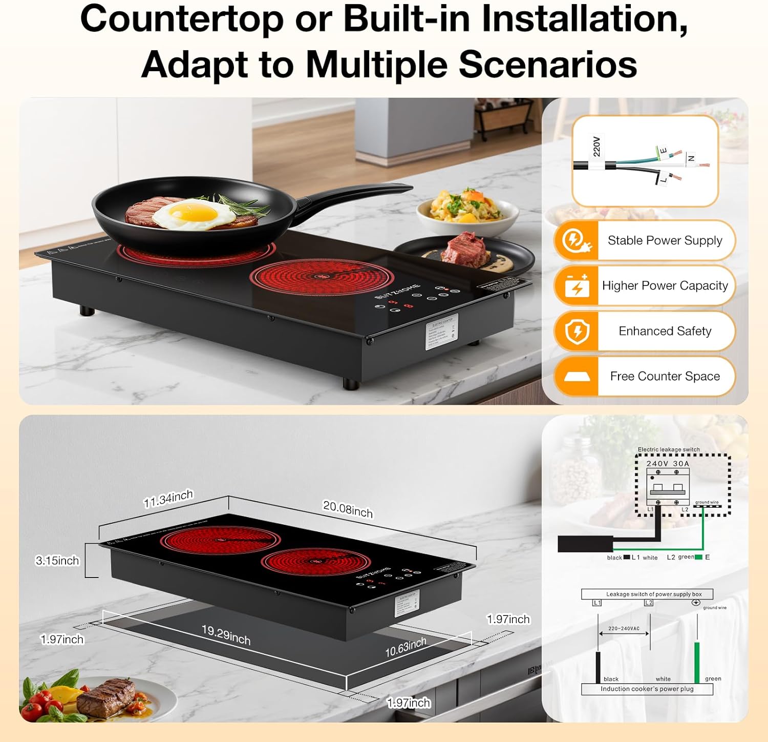 220-240V Electric Cooktop: Flexible installation as built-in or countertop, requiring professional hard wiring (no plug). Provides stable power, higher power capacity, and safety. Product Size: 20.08″ x 11.34″ x 3.15″ (510*288*80mm); Cut-out Size: 10.63″ x 19.29″ (270*490mm). Includes 4 non-slip stands for stability
