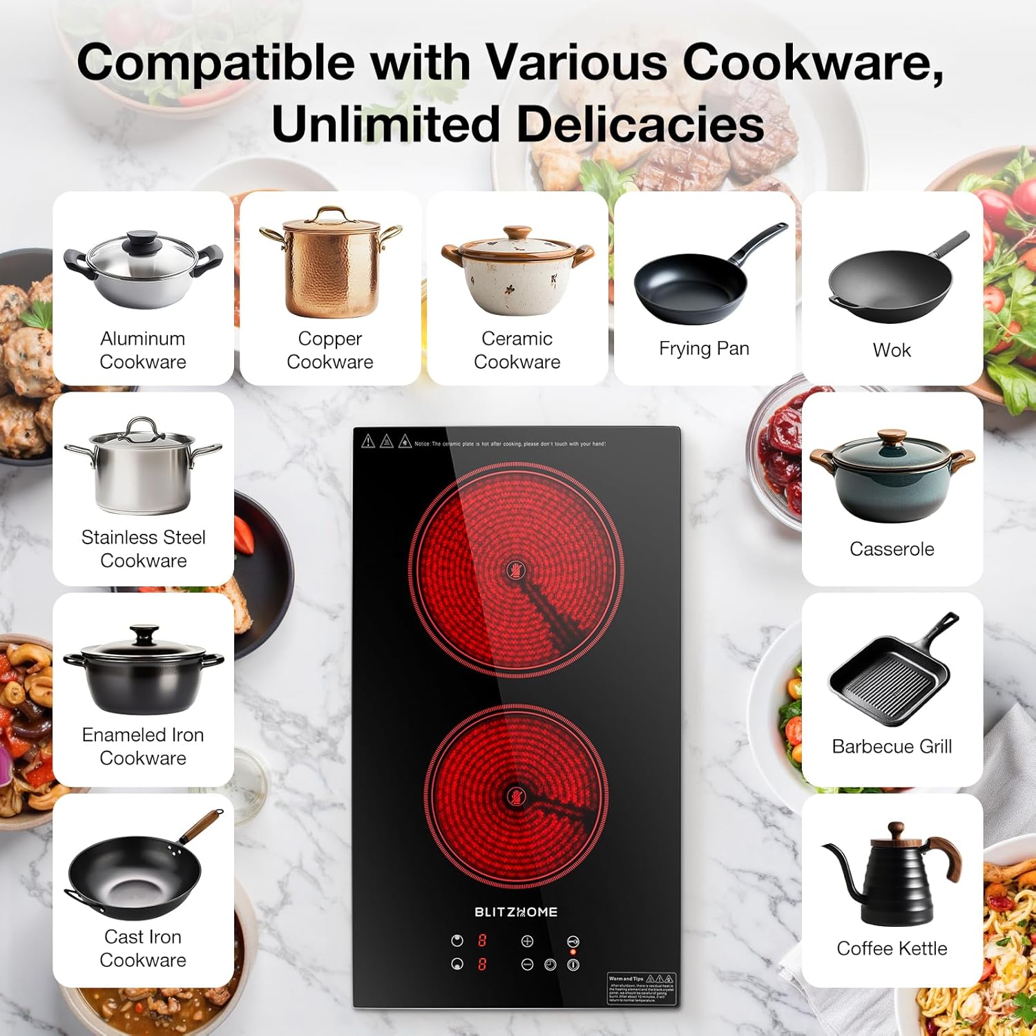 Universal Cookware Compatibility: Cook with confidence using any flat-bottomed cookware, such as cast iron, enameled iron, stainless steel, aluminum, copper, ceramic, and more. The surface ensures even heat distribution across all types of pots and pans
