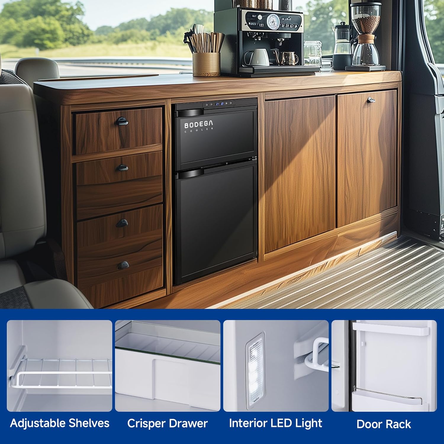 Dual-Temp Smart Storage: BODEGACOOLER RV refrigerator functions as both a 51L fridge and 29L freezer (4.2L) in an intelligent dual-zone design! with the upper compartment for freezing and lower section for refrigeration. Perfectly preserves beverages, meats, seafood, and snacks while traveling. This car refrigerator with universal 12V/24V DC compatibility, making it a versatile portable cooler for your RV, boat, or truck. Ideal choice for camping, road trips, and outdoor adventures.